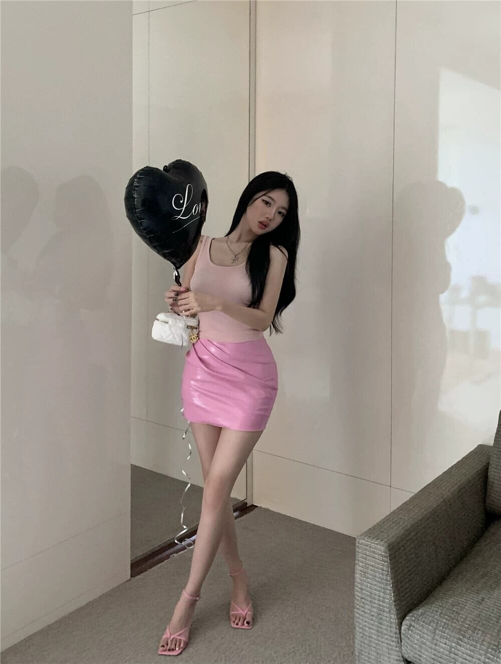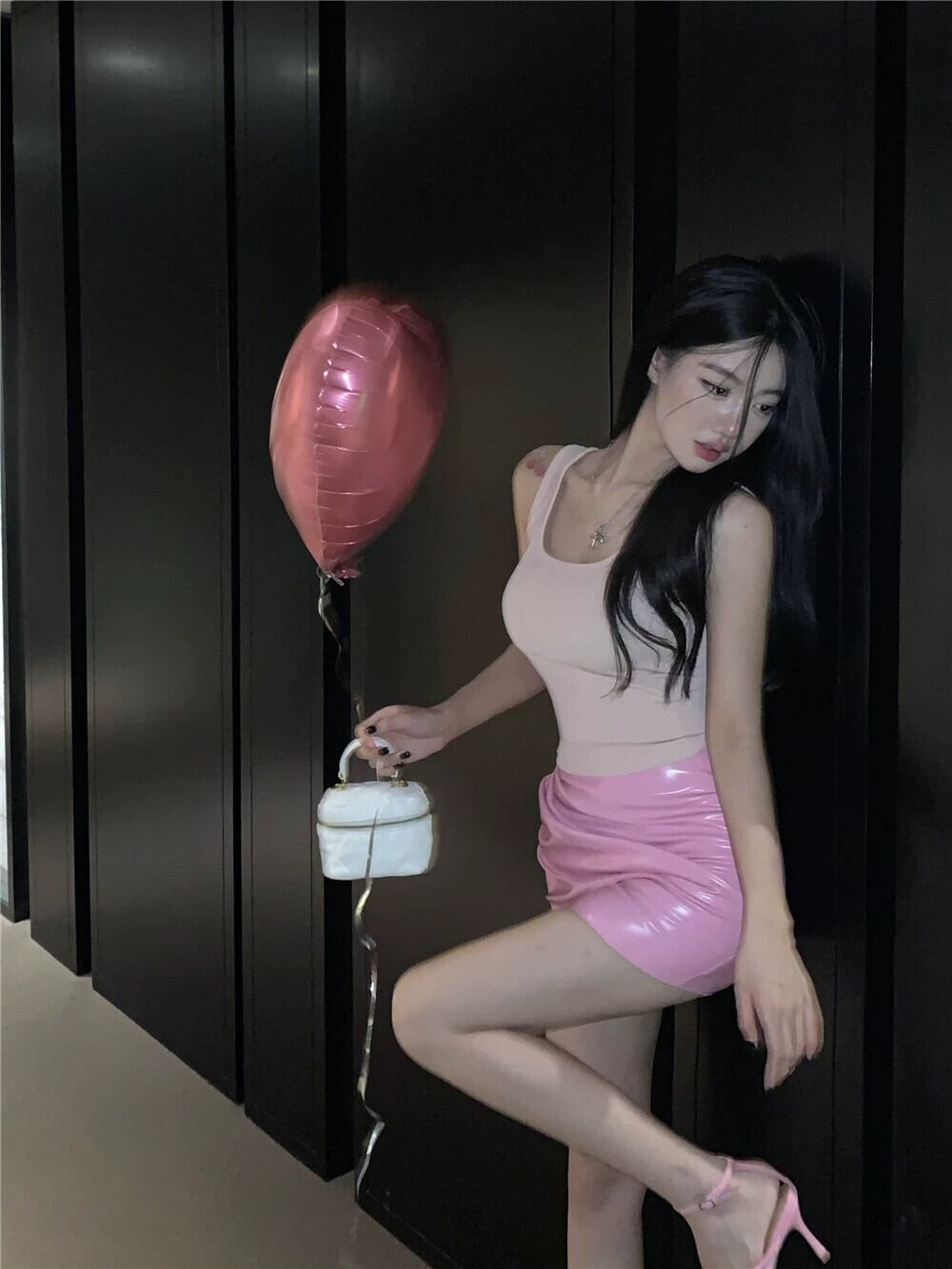 色:ピンクのスリングワンピース,ピンクのレザースカートシングルピース