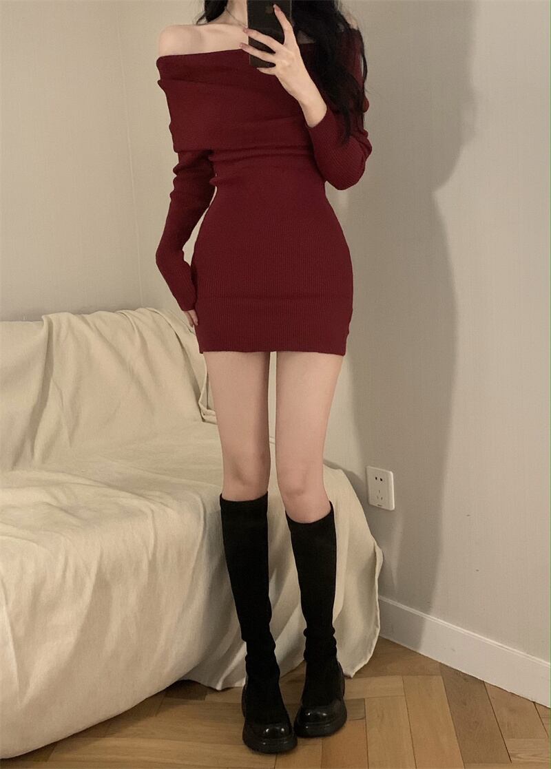 気質ハイエンドのレトロな赤いドレスの女性の春と秋 2023 新しいセクシーなワンラインネックウエストニットスカート レッド スプリング 春物 オータム 秋物 0921928198173300