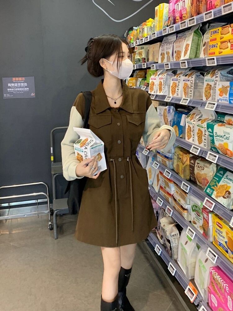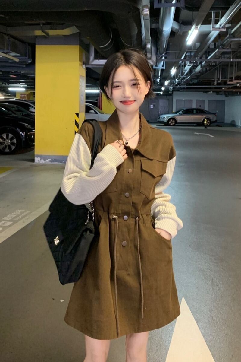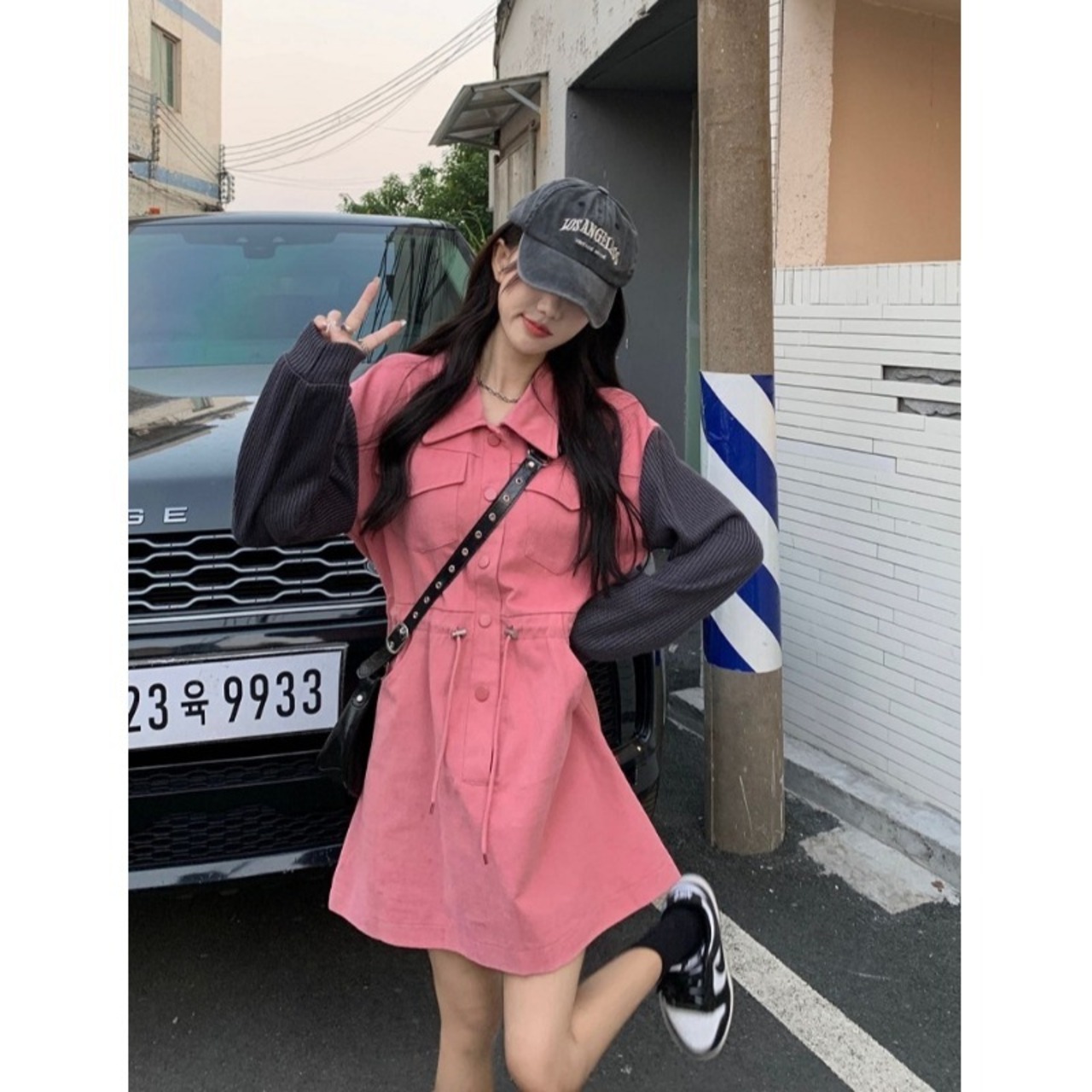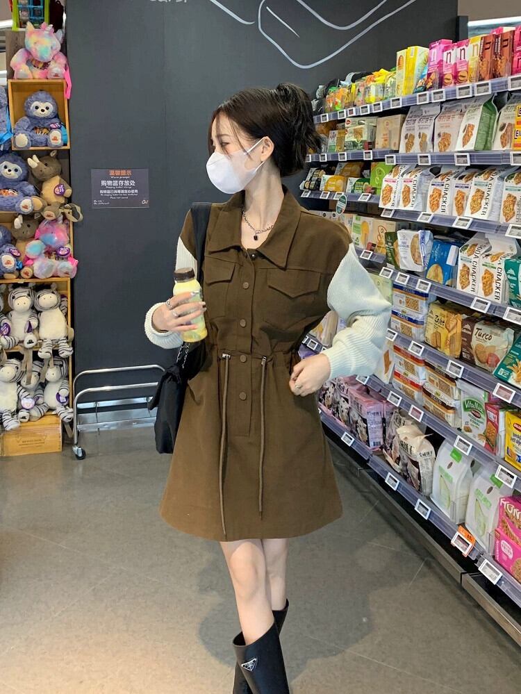 センスポロ襟フェイクツーピース長袖ドレスレディース2023年初春新作スプライシング薄手ツーリングスカート ロング スプリング 春物 0921923916208214