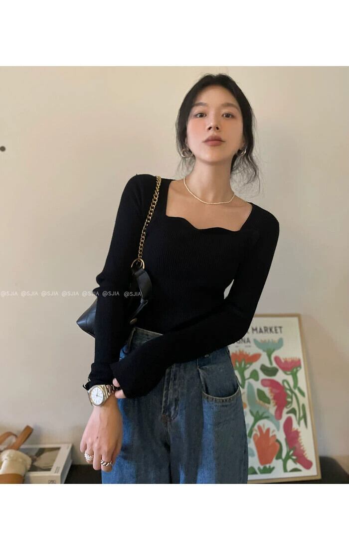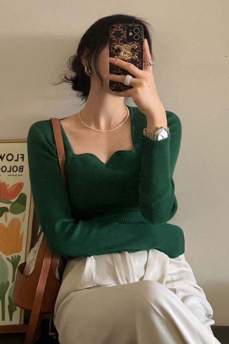 フランスのレトロな気質露出鎖骨グリーン長袖ニットセーター女性の 2023 春の新しいスリムボトムシャツトップ ロング スプリング 春物 0921974431170760