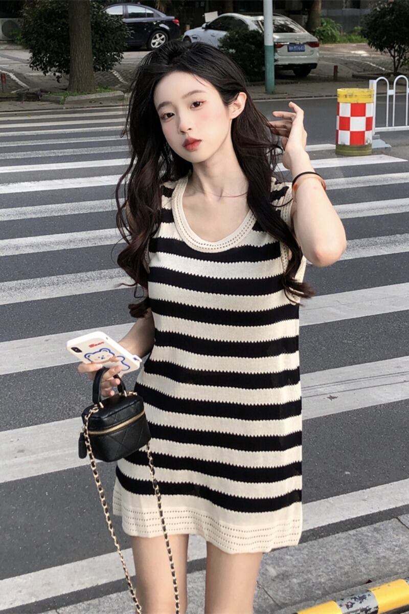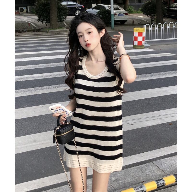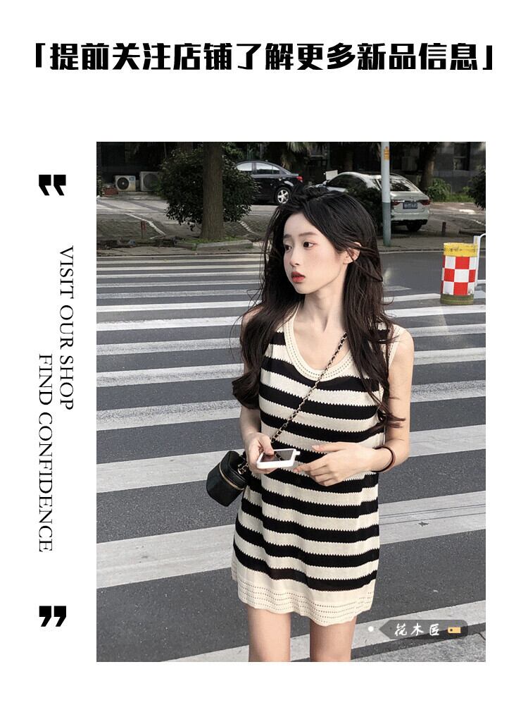 スタイルファッションカラーコントラストストライプノースリーブドレス女性の夏の2023新しいスリムフィットと薄いオールマッチニットスカート サマー 夏物 0921939406661870
