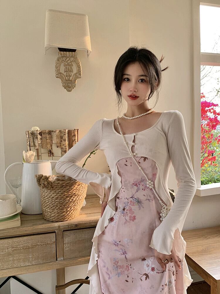 レトロな国民風のファッションスーツスカート女性 2023 春の新作長袖ブラウスプリントサスペンダースカート 2 点セット ロング スプリング 春物 0921996294139518