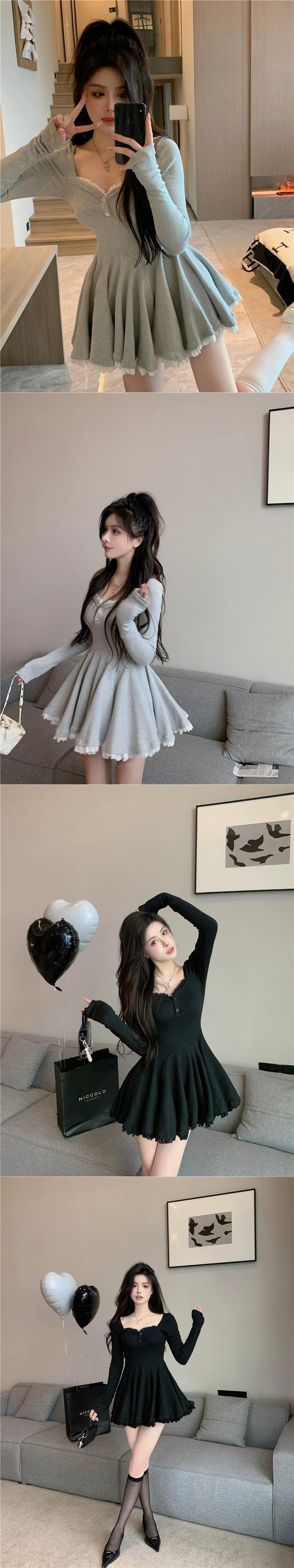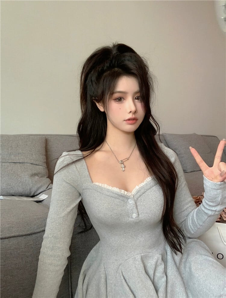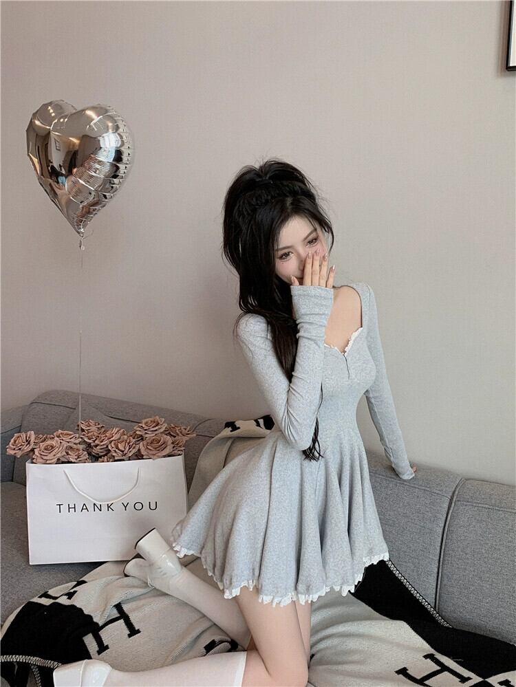 純粋な欲望スタイルグレー長袖ドレス女性の春と秋 2023 新しいウエスト痩身 V ネックプリーツ A ラインスカート ロング スプリング 春物 オータム 秋物 Vネック Aライン 0921935559002265