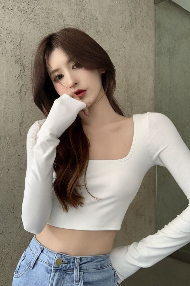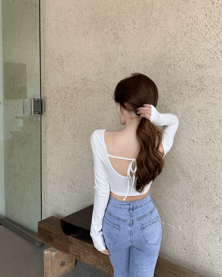香港風味のスタイルのスクエアカラー長袖 T シャツの女性の 2023 年春の新しいバックレスネクタイショートセクションインナーボトリングトップ ロング レッド スプリング 春物 Tシャツ スクウェア 0921979894824464