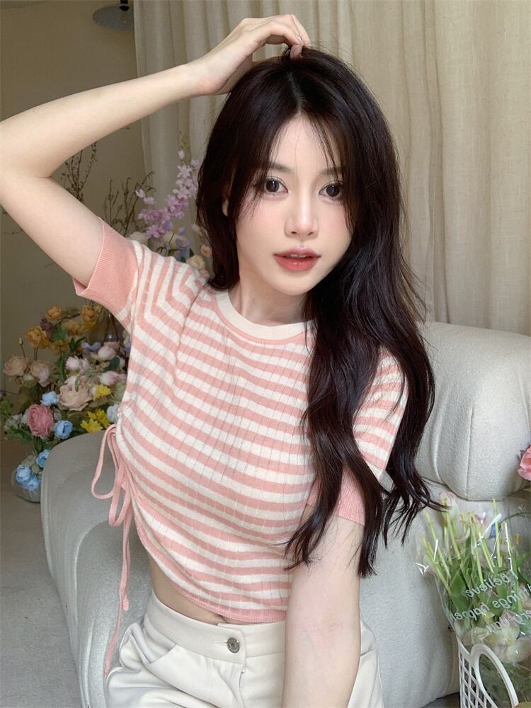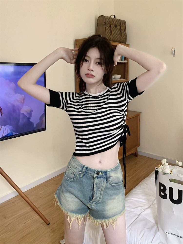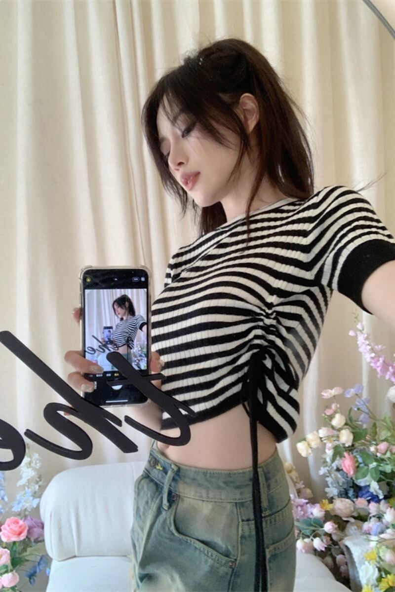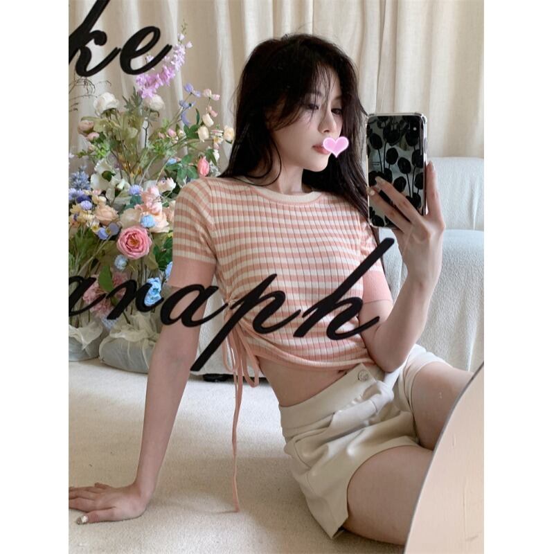 バージョンのカラーコントラストストライプ半袖Tシャツレディース2023年夏新作ウエストストラップスリムフィットスリムショートトップ サマー 夏物 0921924375253384