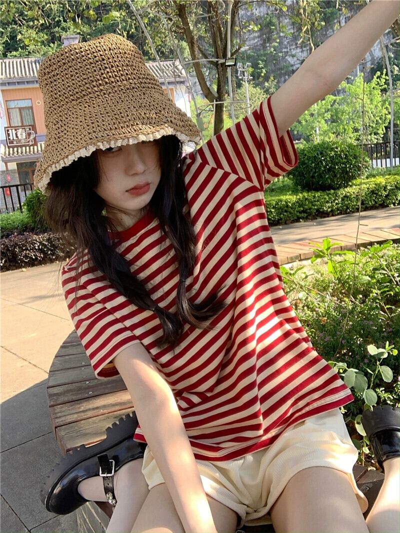 バージョンのカラーコントラストストライプ半袖Tシャツレディース2023年夏新作ゆったり薄手オールマッチラウンドネックプルオーバートップ サマー 夏物 Oネック 0921961748702937