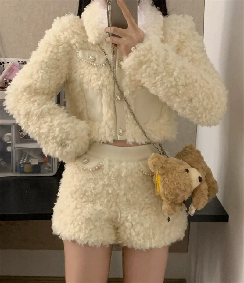 優しい風のバージョンのスーツの女性の 2023 冬の新しい豪華なショート コート トップ ハイウエスト ショーツ 2 点セット ハイウェスト ウィンター 冬物 ブルマー 0921921309261996