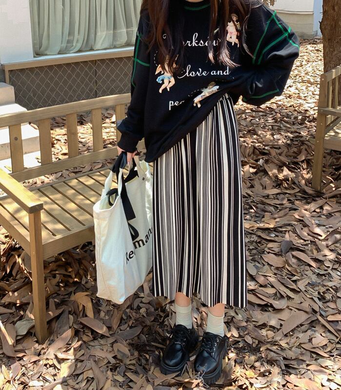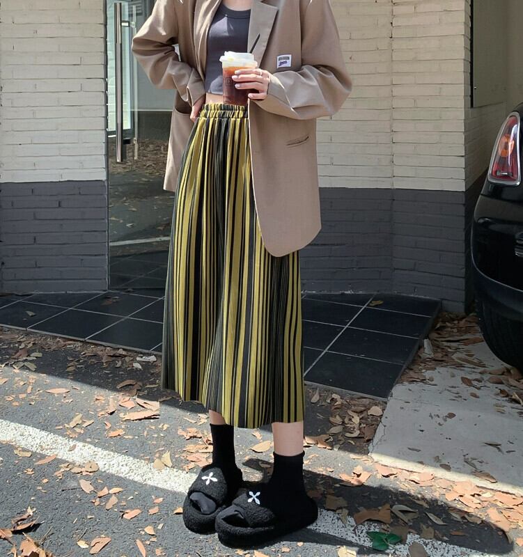 オールマッチ気質縦ストライププリーツスカート女性の 2023 春と秋の新しい弾性ハイウエストスリムミドルスカート ハイウェスト エラスティック 伸縮 スプリング 春物 オータム 秋物 0921980932217292