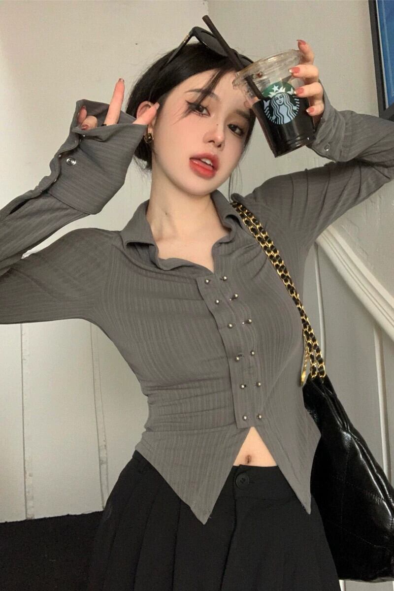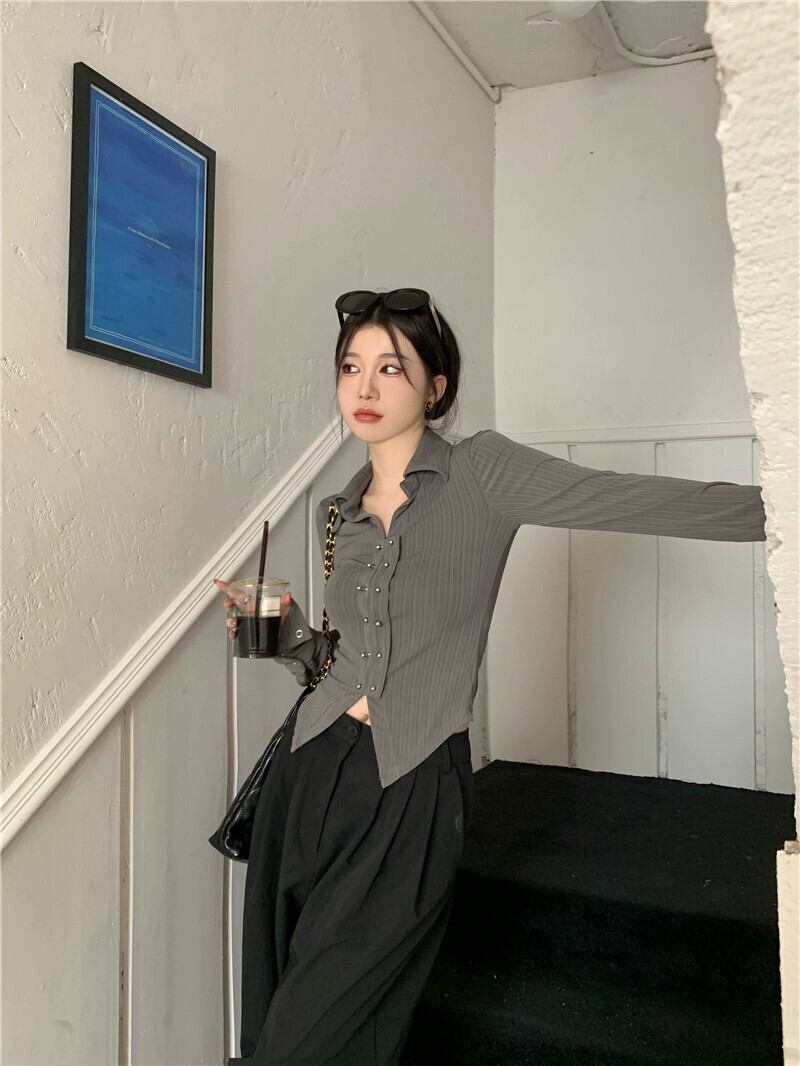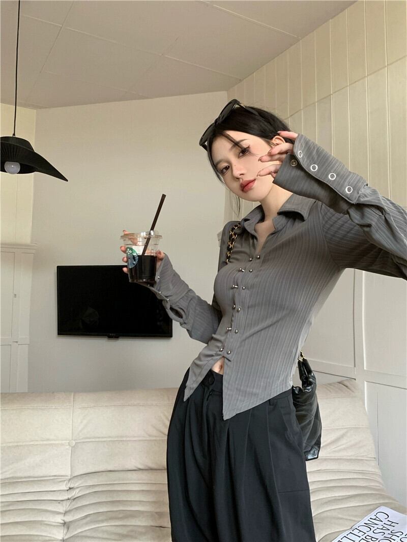 センスニッチ POLO 襟長袖 Tシャツ レディース 2023 春新作 スリムフィット 薄手 ショート グレー トップ潮 ロング スプリング 春物 0921944925244722