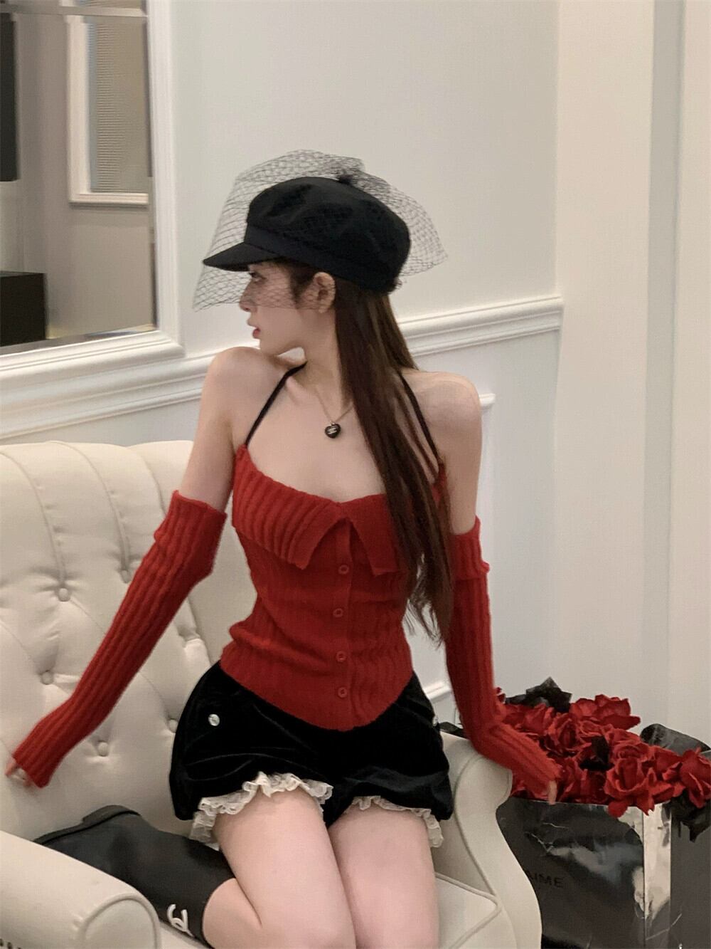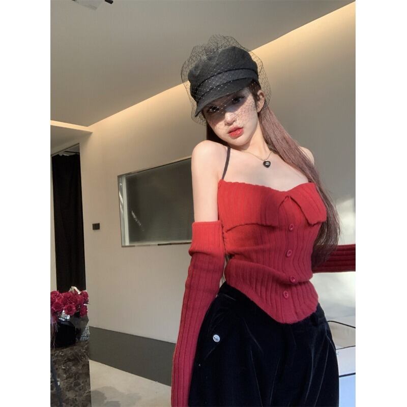 大気赤吊りネックワンネックセーター婦人服 2023 春の新作痩身スリミング甘くてスパイシーなトップ レッド 大人ガーリー スウィート キュート カジュアル スプリング 春物 0921954208742992