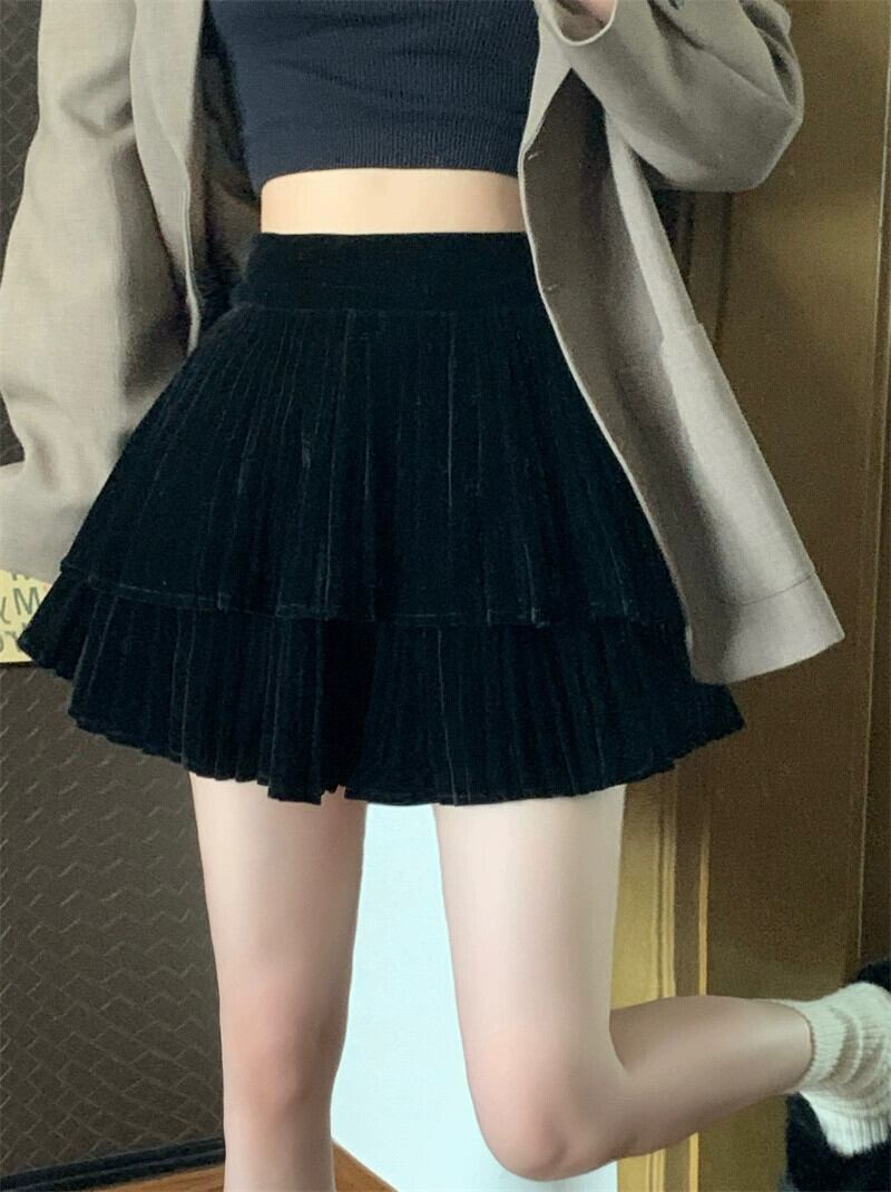 黒ベルベットスカート女性の春と秋 2023 新しいハイウエストオールマッチ薄型プリーツスカートショートスカートケーキスカート ハイウェスト ブラック スプリング 春物 オータム 秋物 0921928130392401
