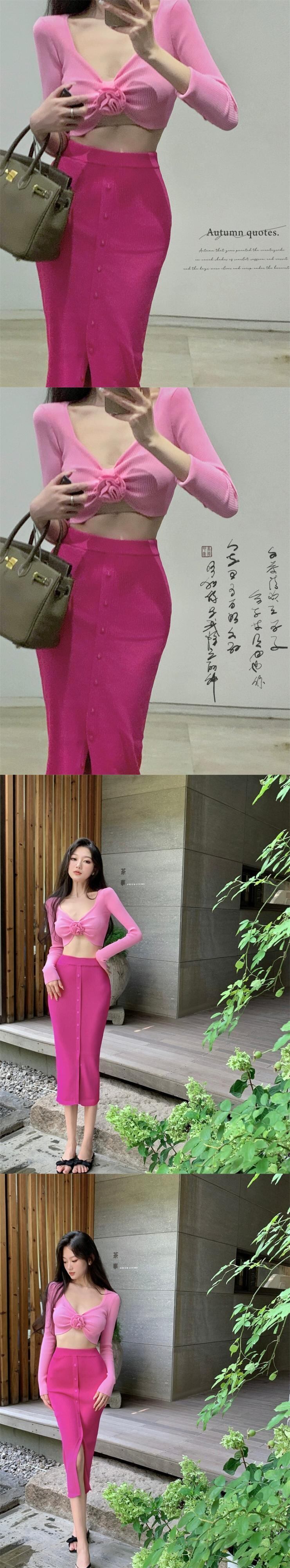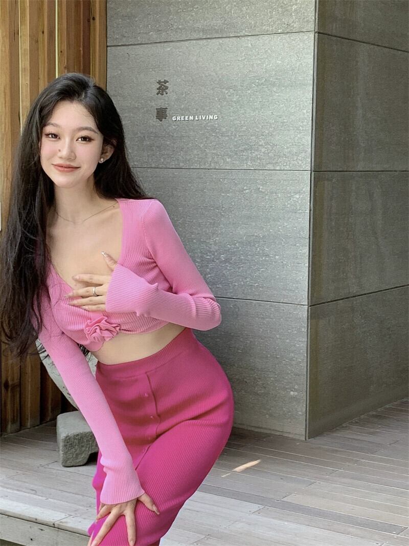 セクシーな風ファッションニットスーツ女性 2023 春の新 V ネックフラワートップスリットバッグヒップスカート 2 点セット スプリング 春物 Vネック フラワーデザイン 0921953273777006
