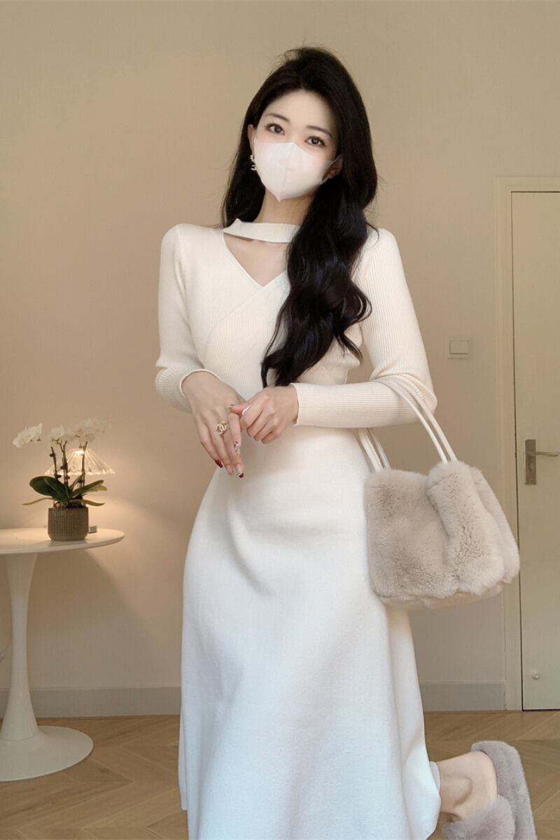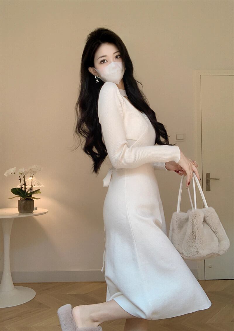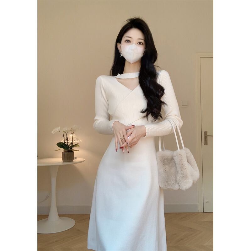 穏やかな気質の中空長袖ドレスの女性の 2023 春の新しいデザインセンスのクロスウエストニットスカート ロング スプリング 春物 092197194648788