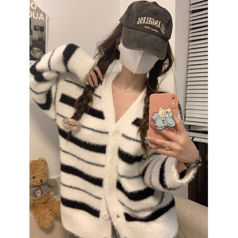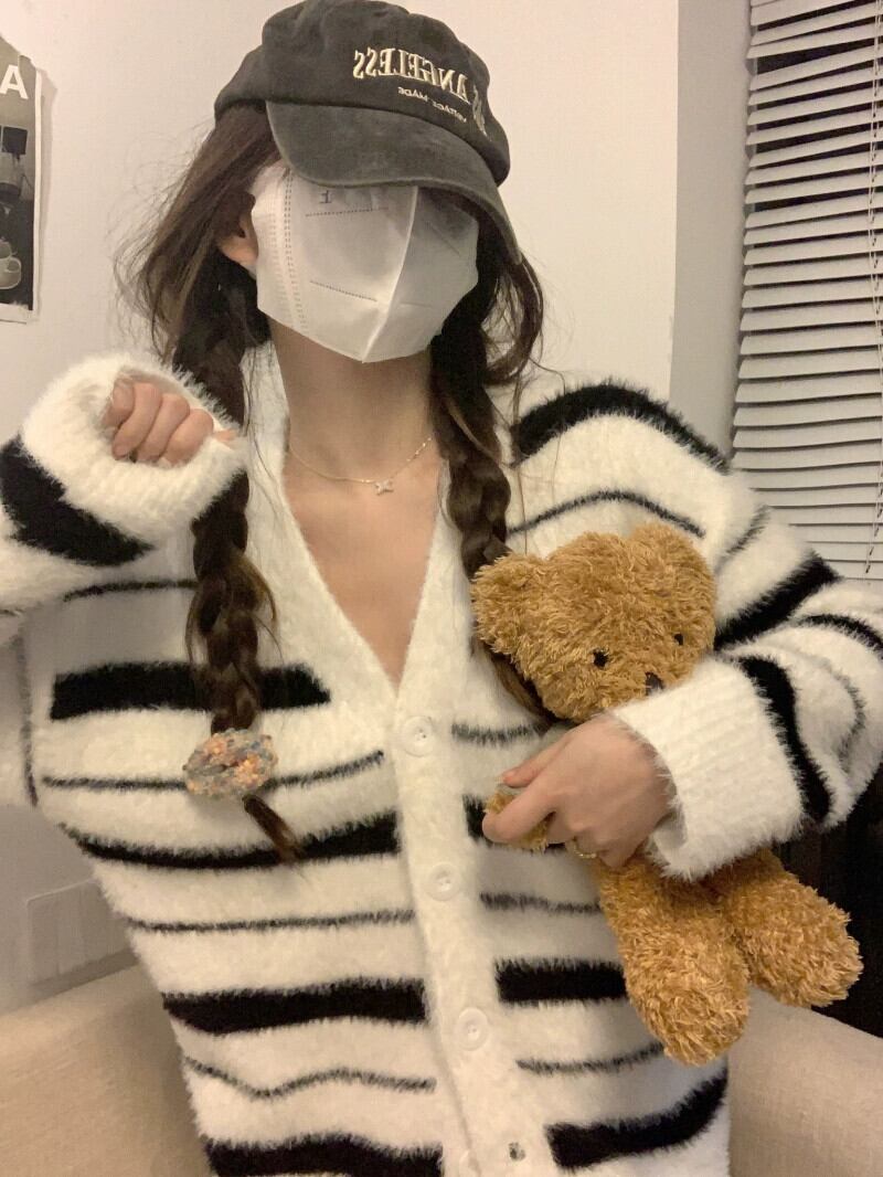 甘い怠惰なスタイルニットカーディガン女性の春と秋 2023 新しいコントラストカラーストライプぬいぐるみレトロ V ネックセータージャケット 大人ガーリー スウィート キュート カジュアル スプリング 春物 オータム 秋物 Vネック 0921962722532667