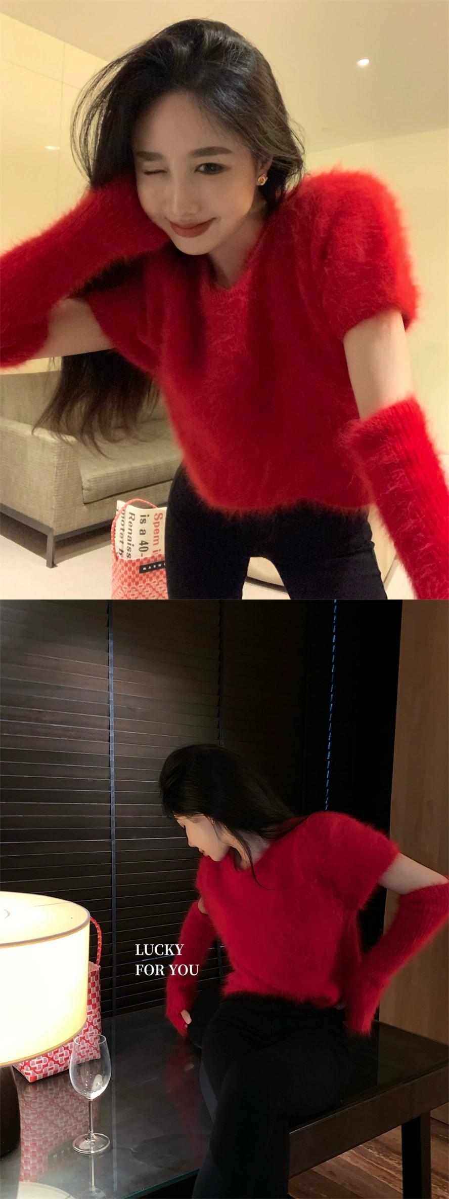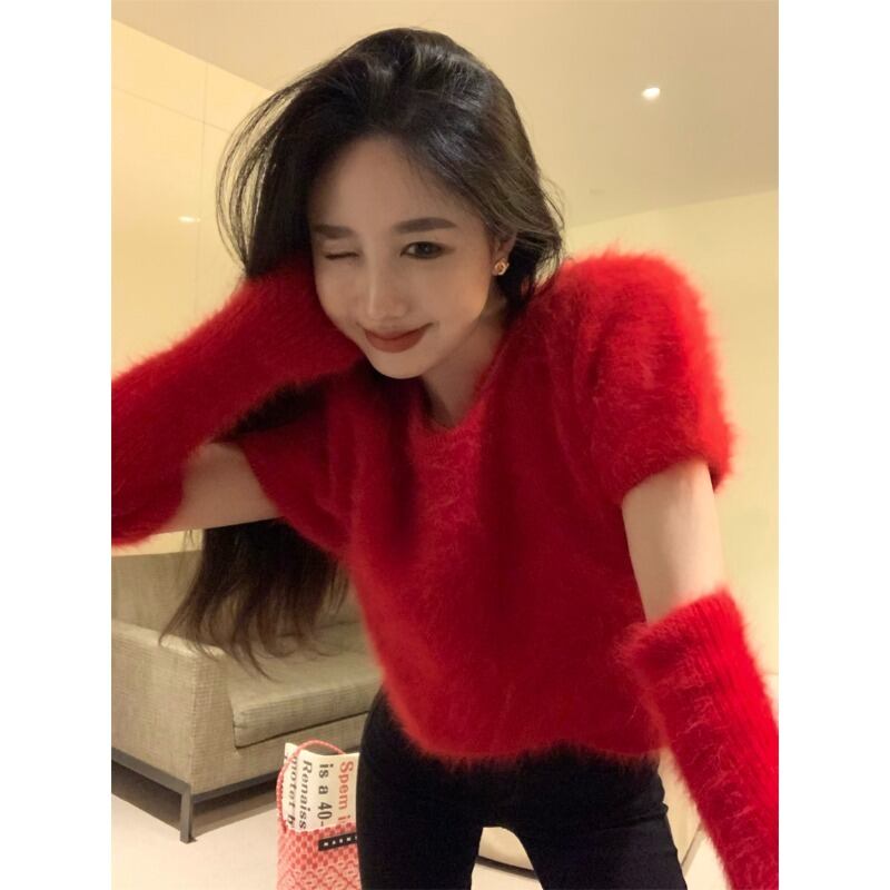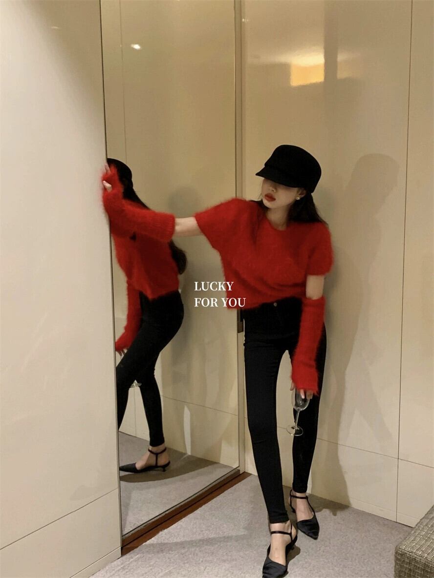 クリスマスレッド雰囲気センスプルオーバーセーターレディース2023冬新デザインセンススリムフィット袖付きニットトップ ウィンター 冬物 0921970755702734