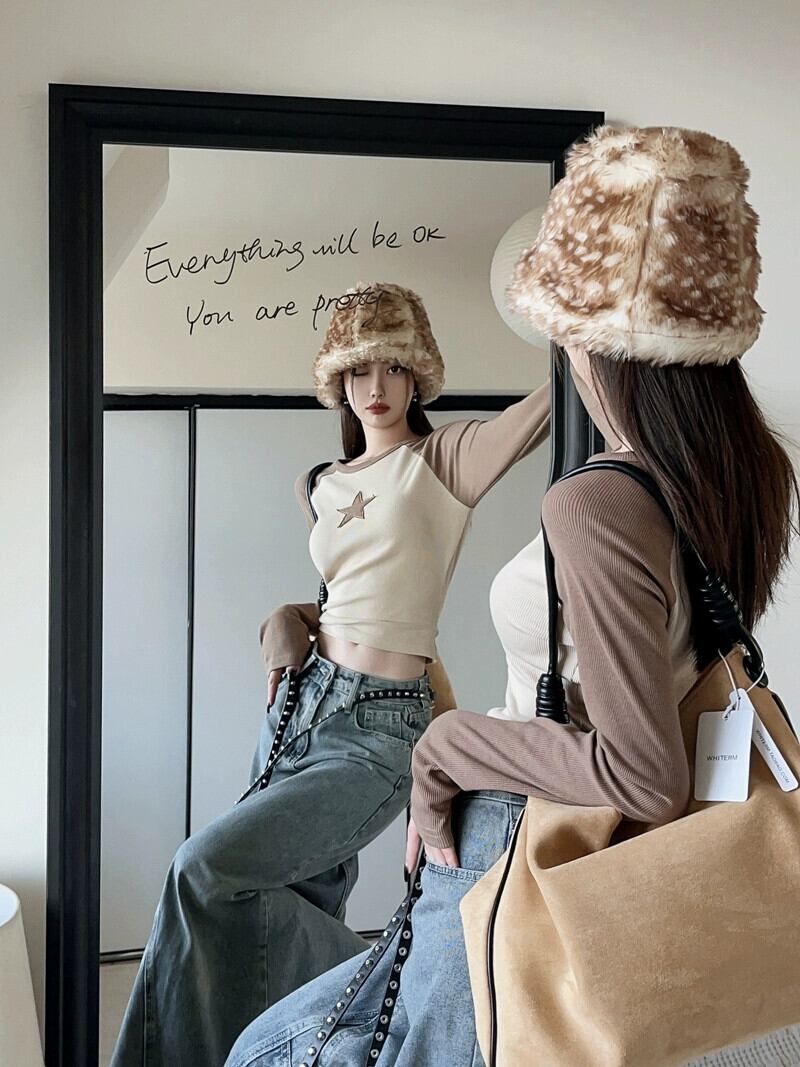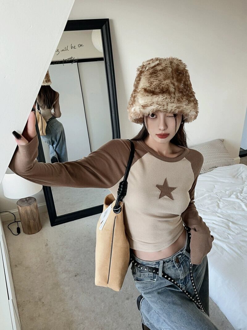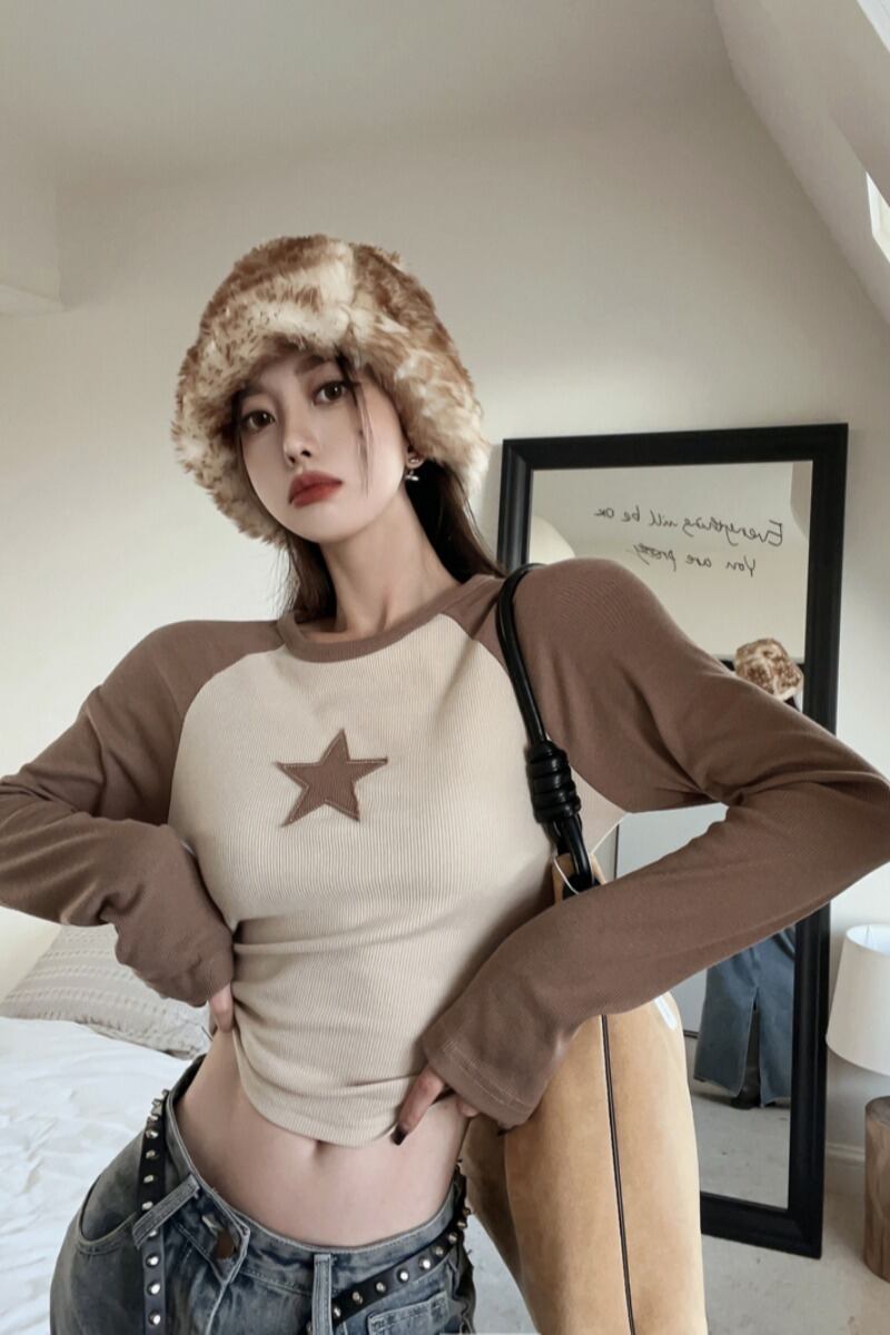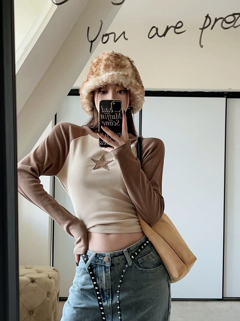 レトロスタープリントカラーコントラストステッチ長袖Tシャツレディース2023春新作ショートセクションスリムスリムトップトレンディ ロング スプリング 春物 092199704365617