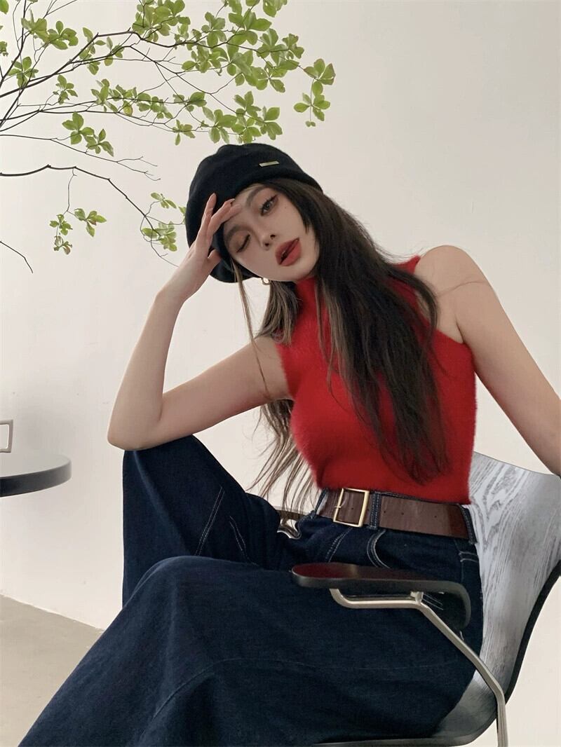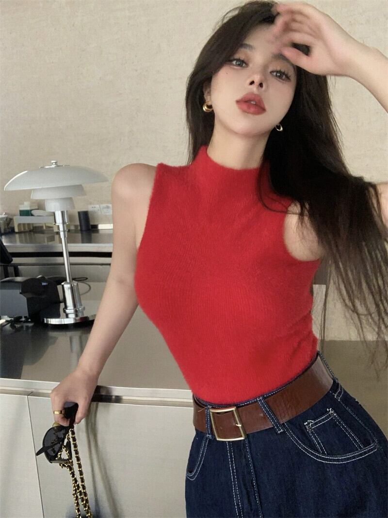 セクシーな ins スタイルハイネックニットベスト女性 2023 春の新しいスリムフィットショートノースリーブトップ 半袖 ハーフスリーブ スプリング 春物 0921948644240331