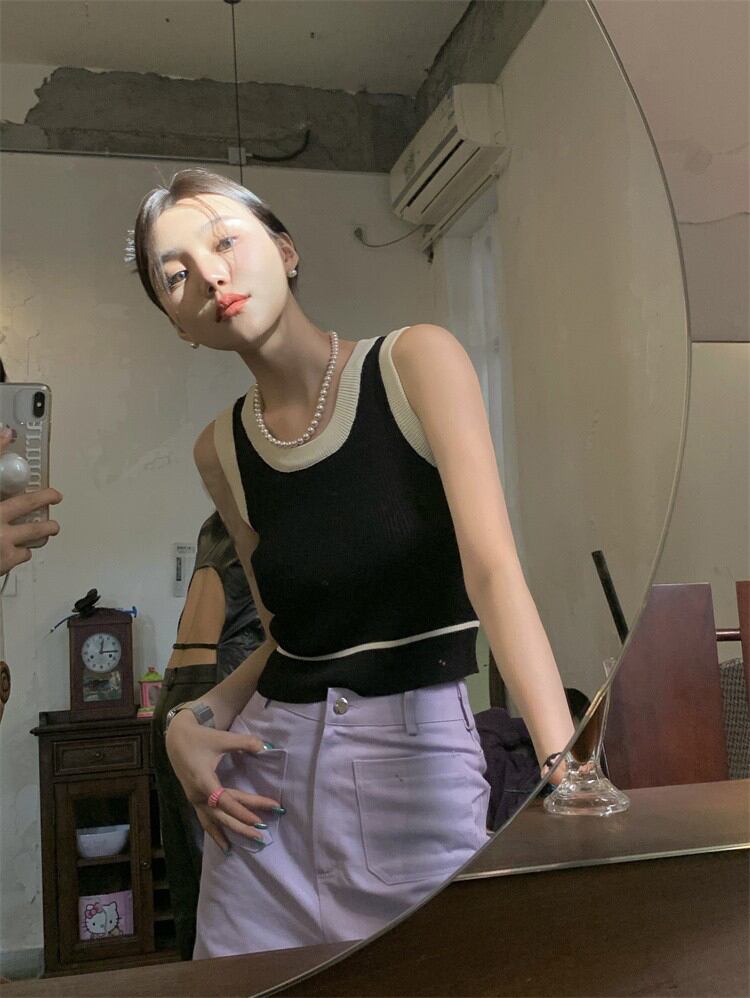 2023年夏のコントラストカラーニットベストレディースインナーウェア自己修養の新しいデザイン感覚とスリムなボトムショートトップスアウターウェア サマー 夏物 0921970059761476