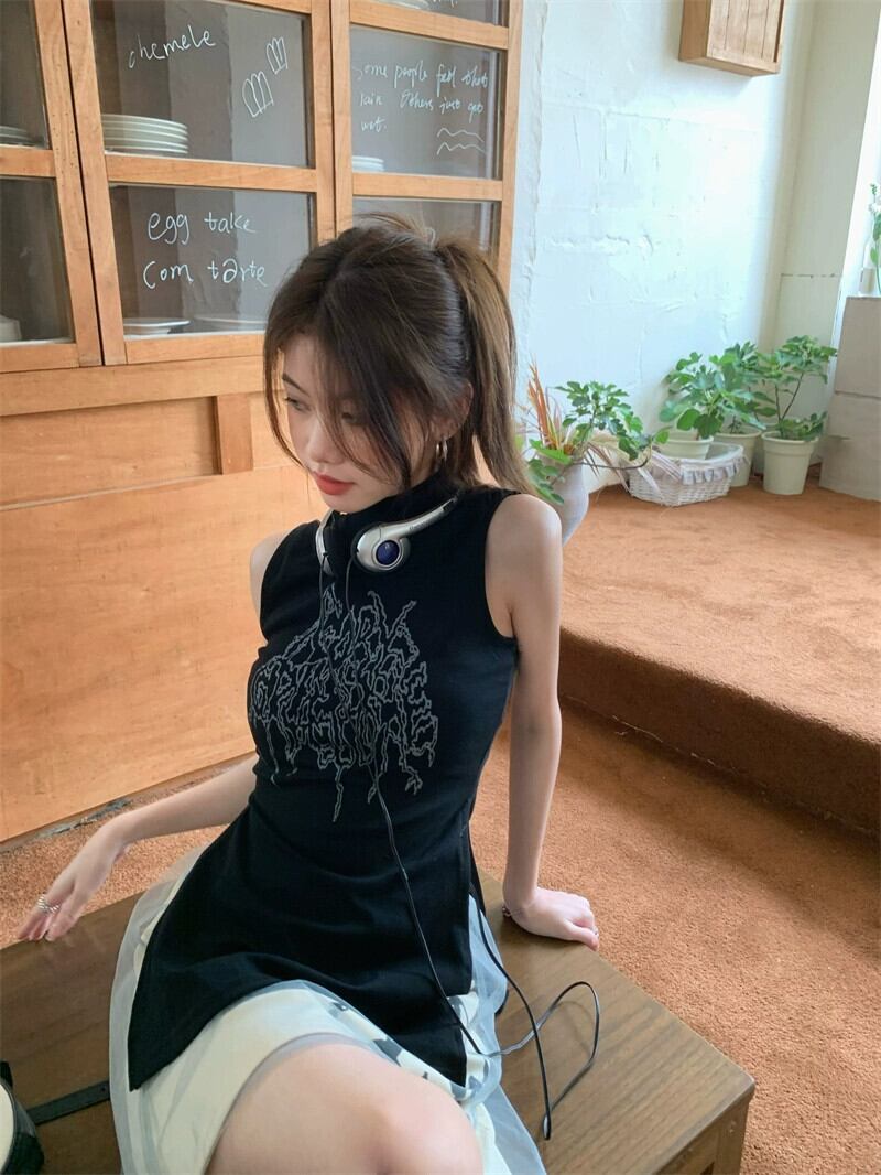 レトロな新中国ファッションスーツ女性 2023 春の新ハーフハイカラーノースリーブ Tシャツプリントスカート 2 点セット スプリング 春物 0921926042010954