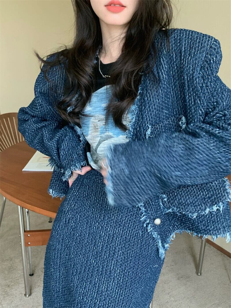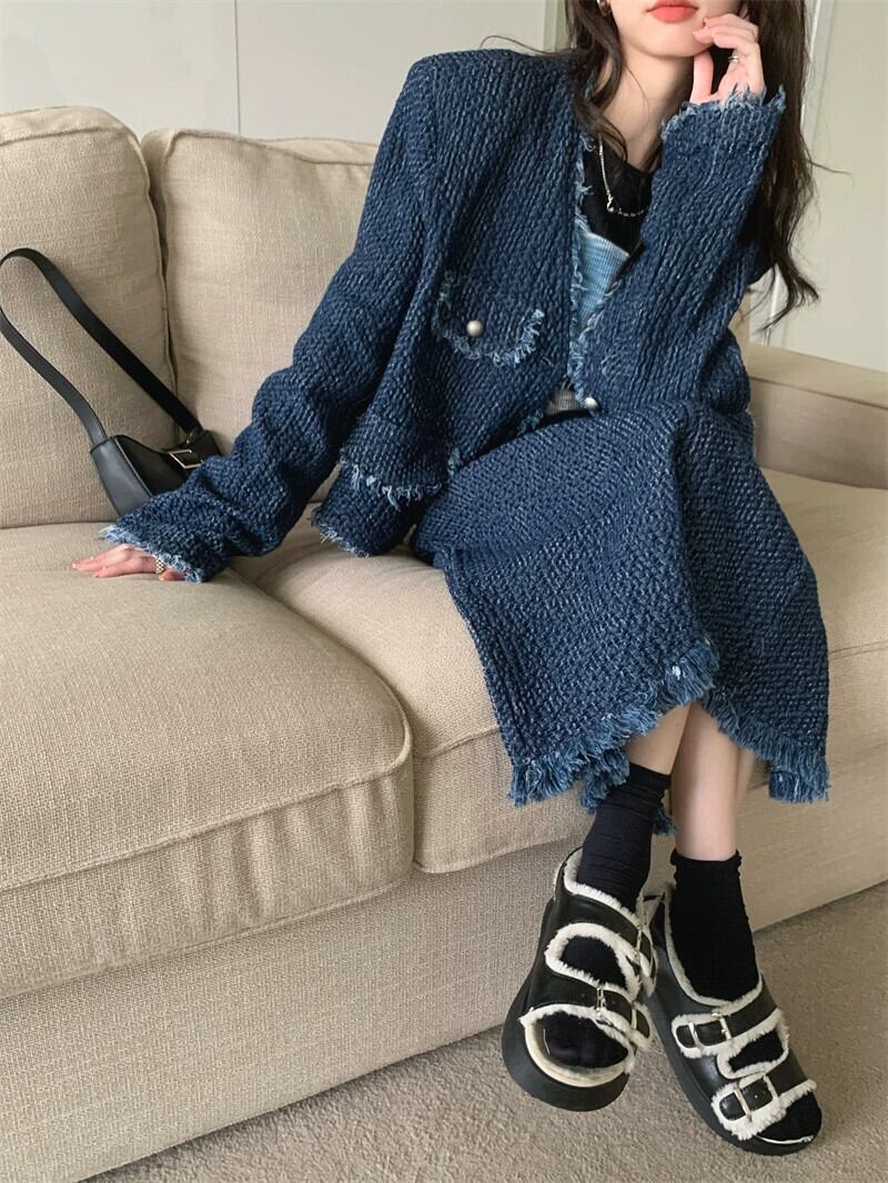 レトロな香港スタイルのデニムスーツの女性の 2023 冬の新しい小さな香りスタイル V ネックジャケットミドル丈スカート 2 点セット ウィンター 冬物 Vネック 0921993465152827