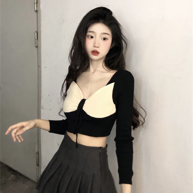 -エンドヒットカラーと薄く見えるVネック長袖ニットセーターレディース2023年春の新しいシックなショートトップトレンド ロング スプリング 春物 0921995824214654