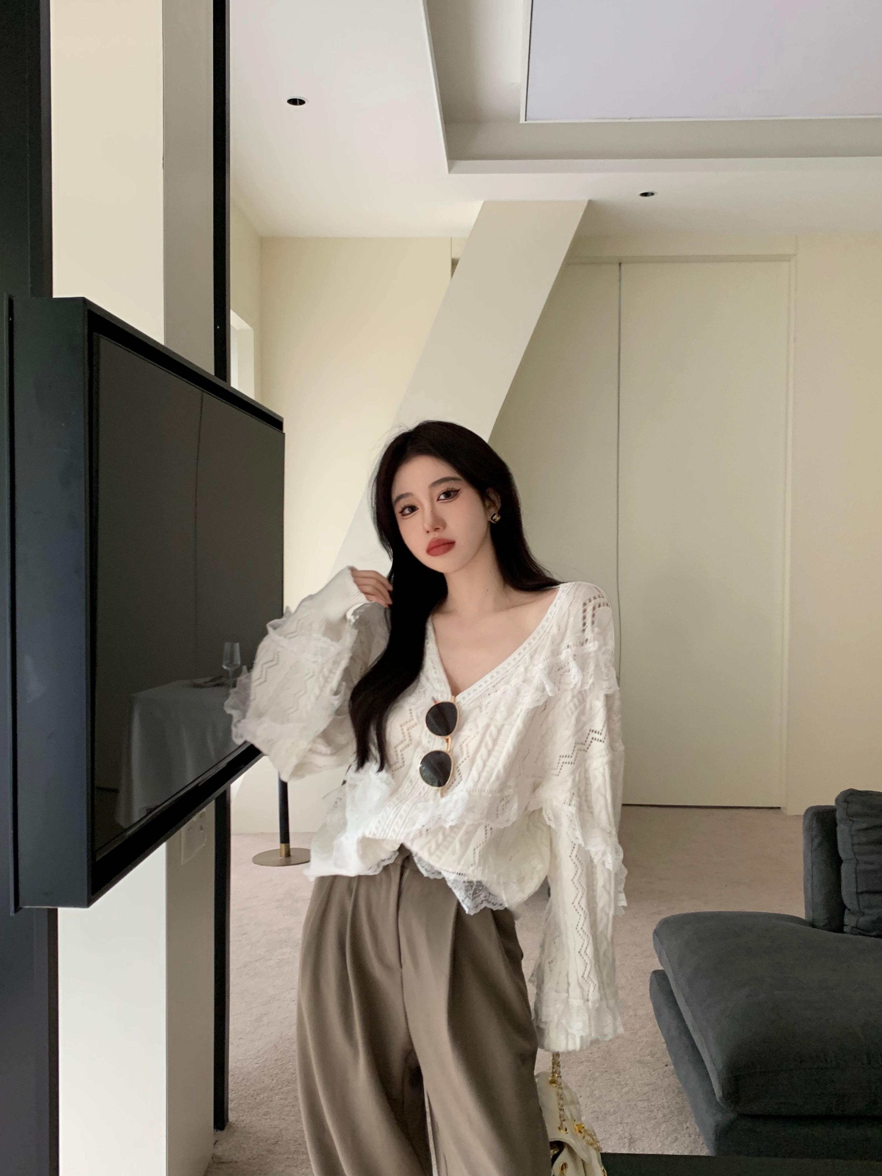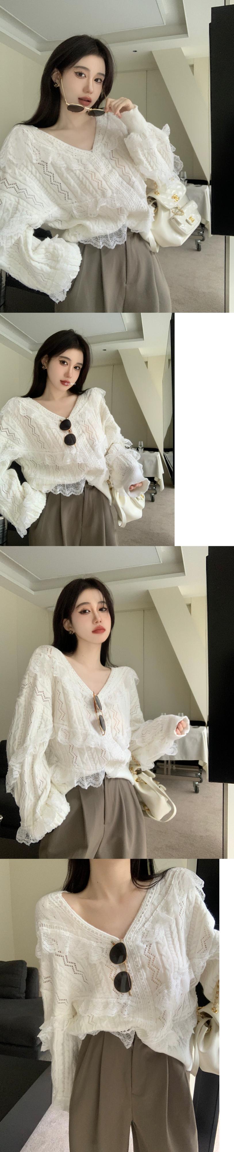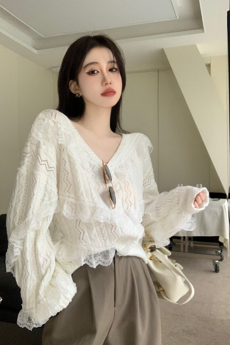 優しい風レースステッチプルオーバーセーター女性の 2023 春の新しい怠惰なスタイルオールマッチ V ネックセーター スプリング 春物 Vネック 0921933982450023