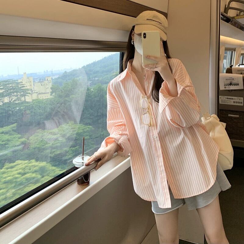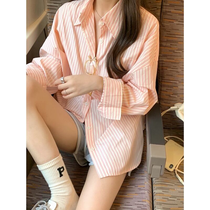 -エンドピンクストライプ長袖シャツレディース2023年夏新作ミドル丈ゆったり薄手カーディガンシャツ ロング サマー 夏物 0921929283141106