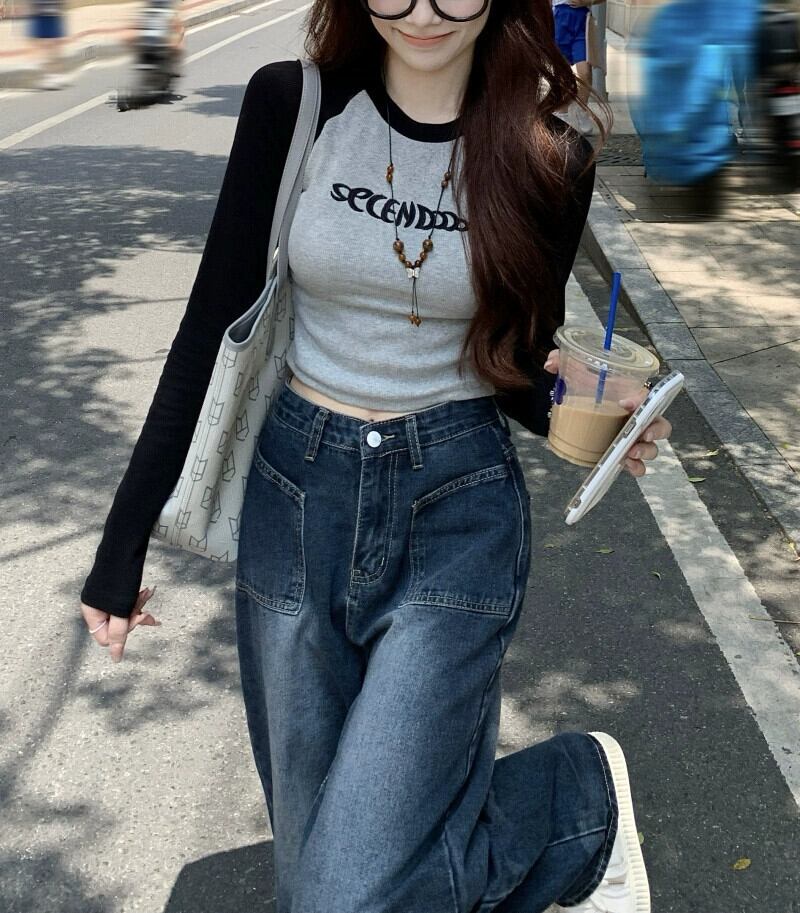 スタイルコントラストカラーレター刺繍長袖 Tシャツレディース 2023 春の新作スリムフィットと薄いショートボトムシャツ ロング スプリング 春物 0921921990546060