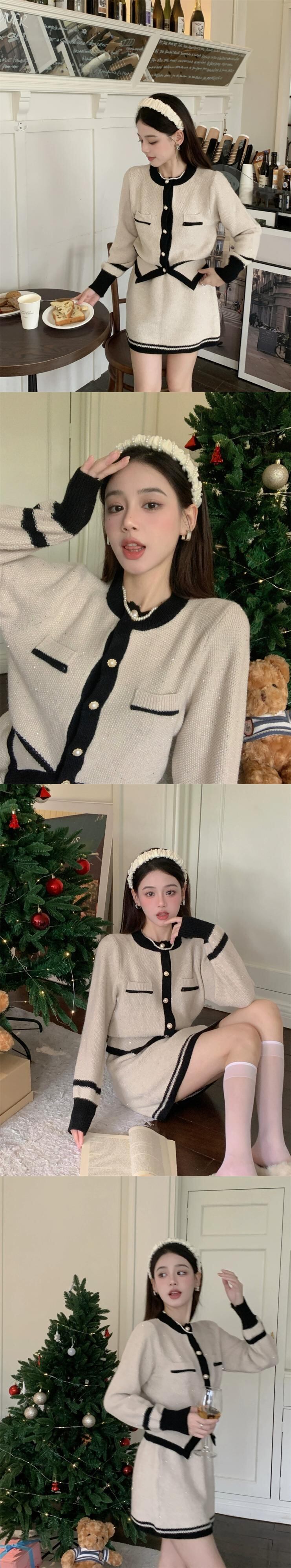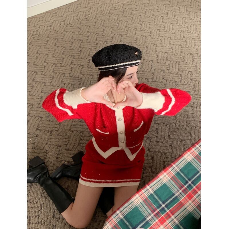レトロな小さな香りニットスーツの女性の春と秋の 2023 新作カーディガントップスリムスカートスカートツーピーストレンディ スプリング 春物 オータム 秋物 0921914085902599