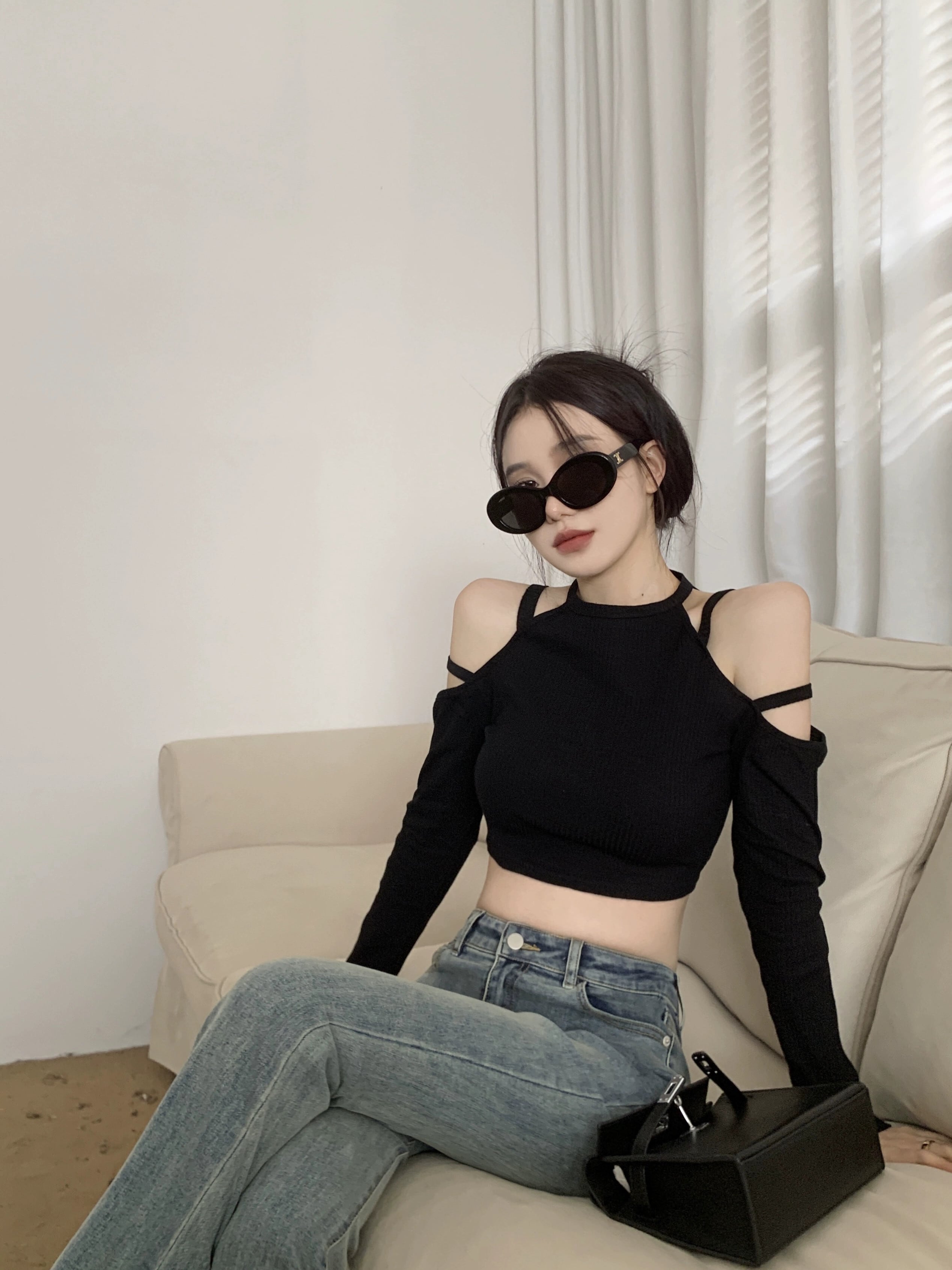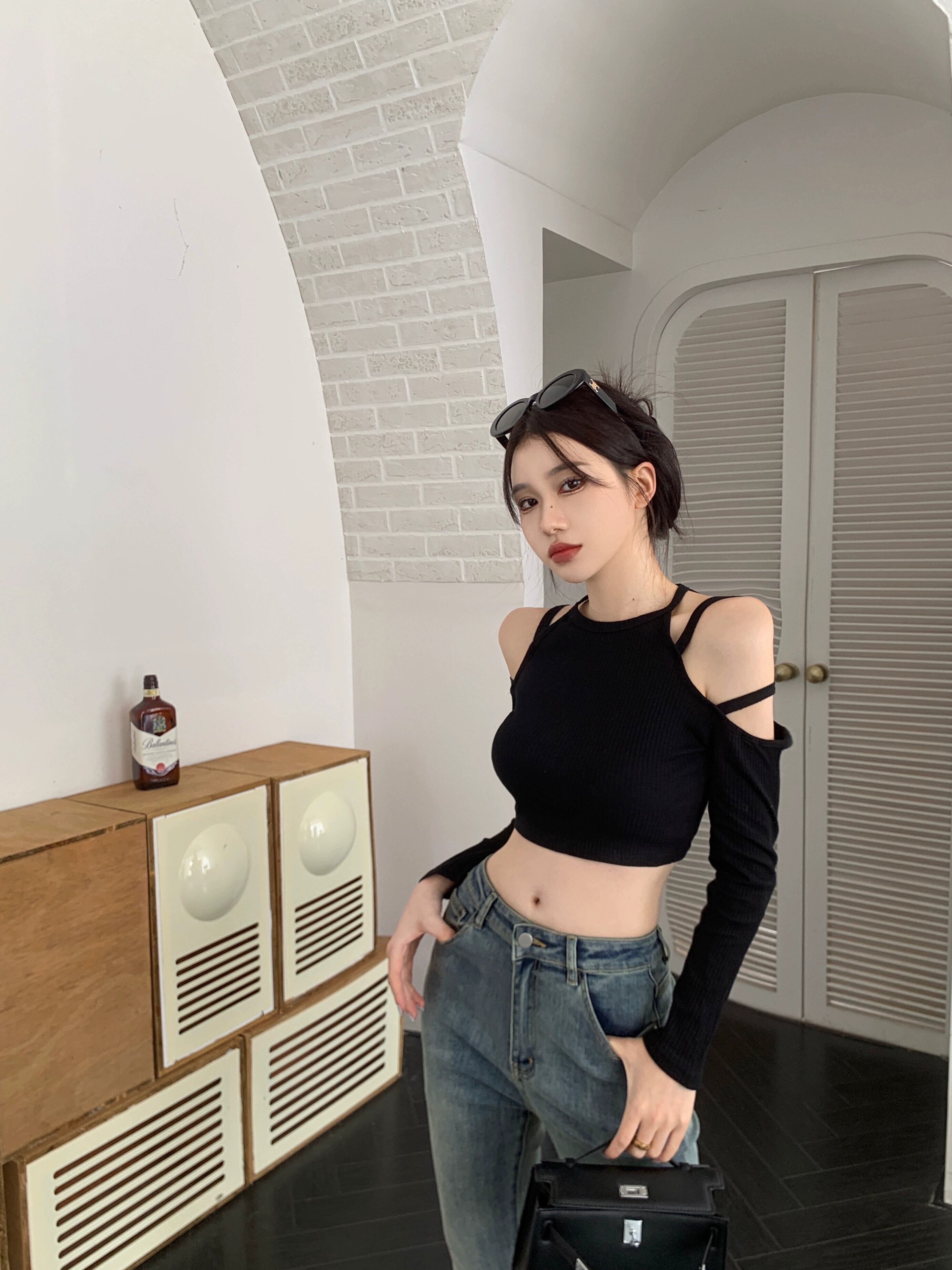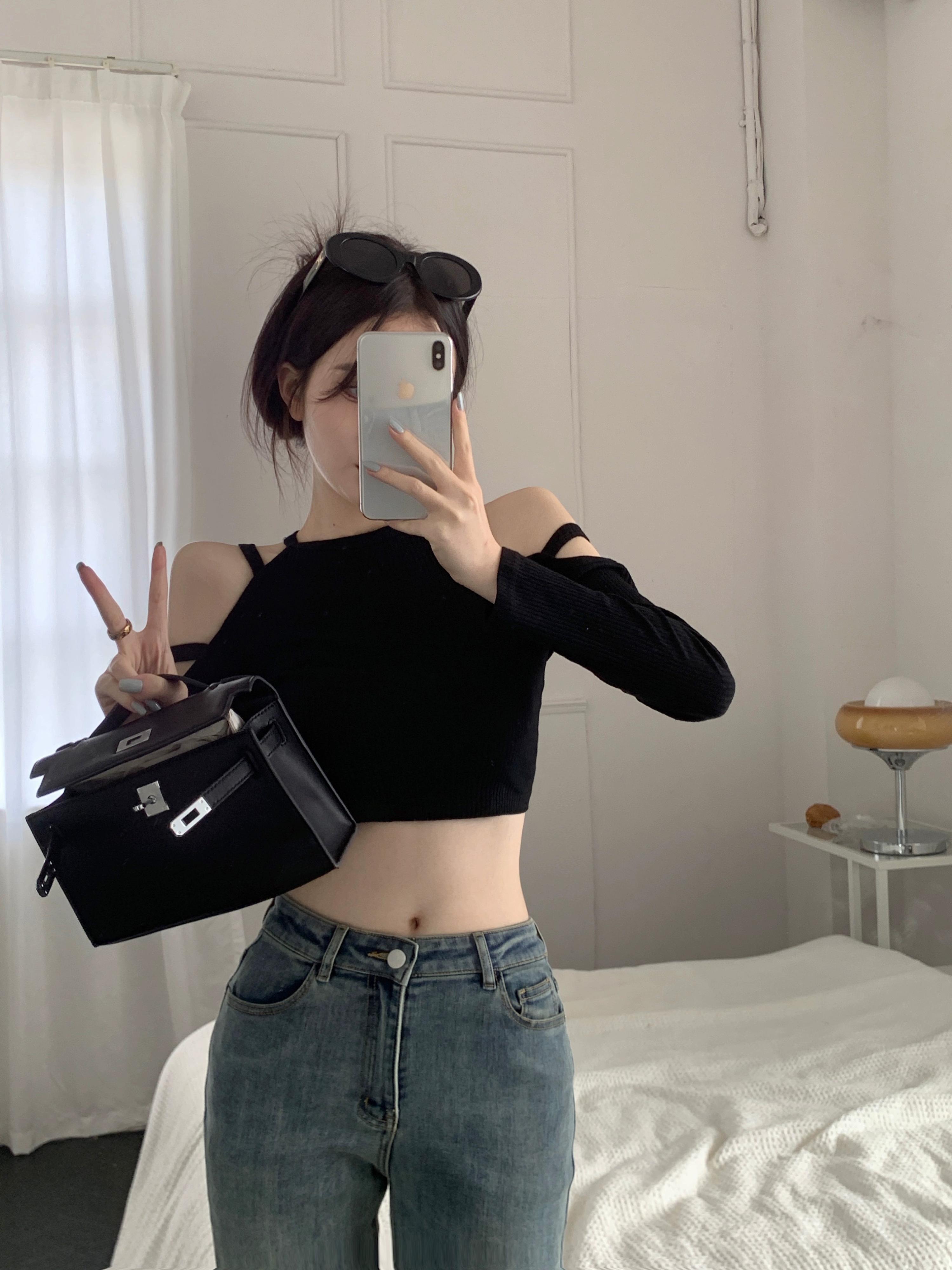 センスニッチ ブラック オフショルダー ショート 長袖 Tシャツ レディース 2023 春先新作 着痩せ 薄手 ボトムス トップス ロング スプリング 春物 09219425985786