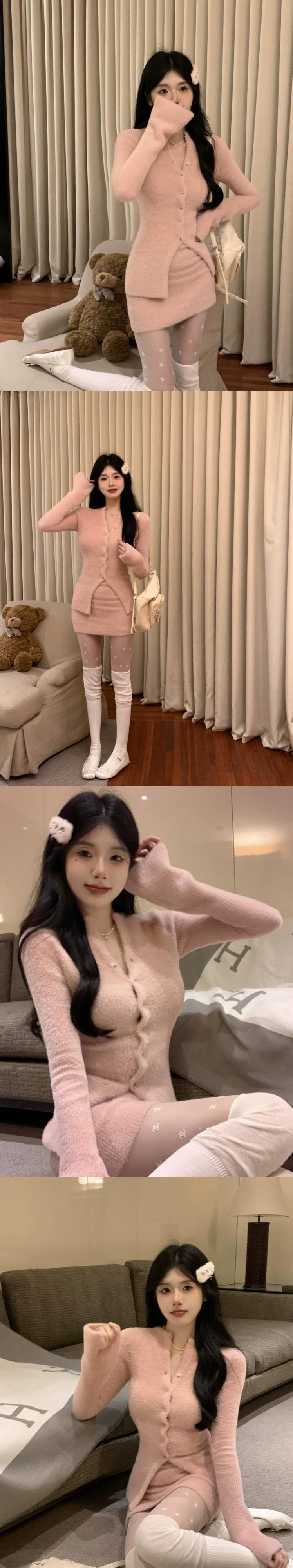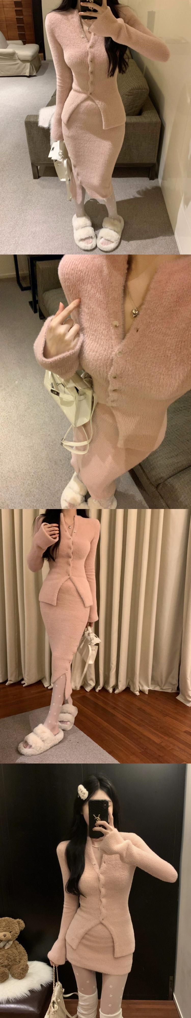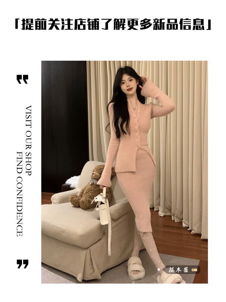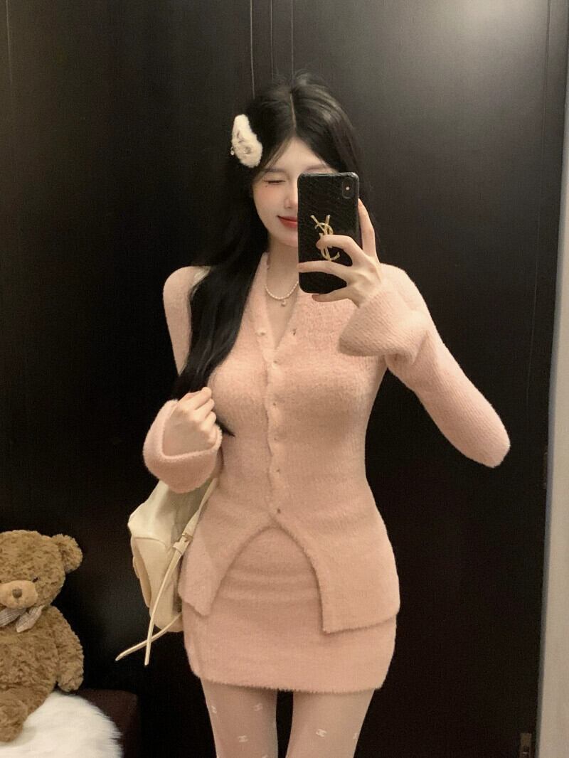 スイート スパイス ガール ピンク スリム V ネック ニット カーディガン セーター女性春と秋の純粋な欲望スーツ パッケージ ヒップ スカート 2 点セット 大人ガーリー スウィート キュート カジュアル スプリング 春物 オータム 秋物 Vネック ピュア 0921960683617761