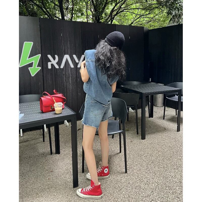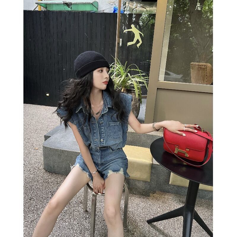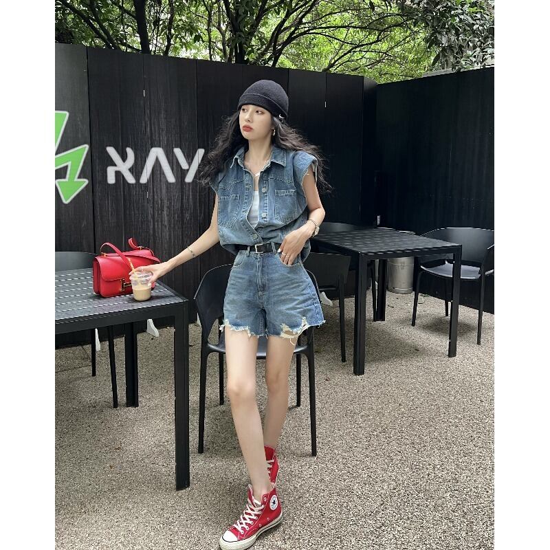 香港スタイルのレトロな高品質デニムベストスーツ女性の夏のハイウエストワイドレッグパンツショーツ2点セット潮 ハイウェスト サマー 夏物 ブルマー 0921988328537003