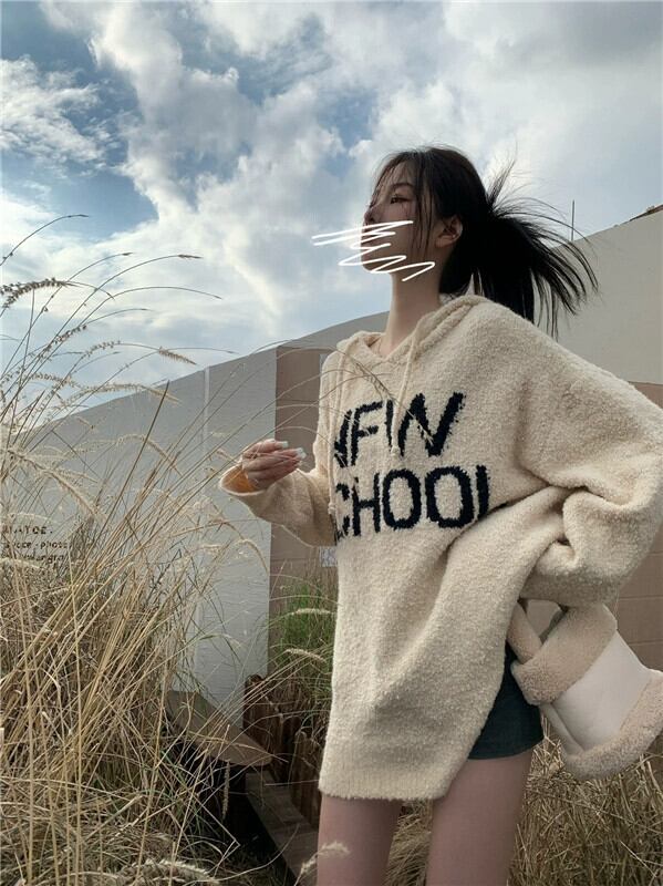 レイジー スタイル レター フード付きセーター ジャケット レディース 2023 冬の新しいルーズで多用途なミッドレングス ニット トップ ウィンター 冬物 0921980117817617