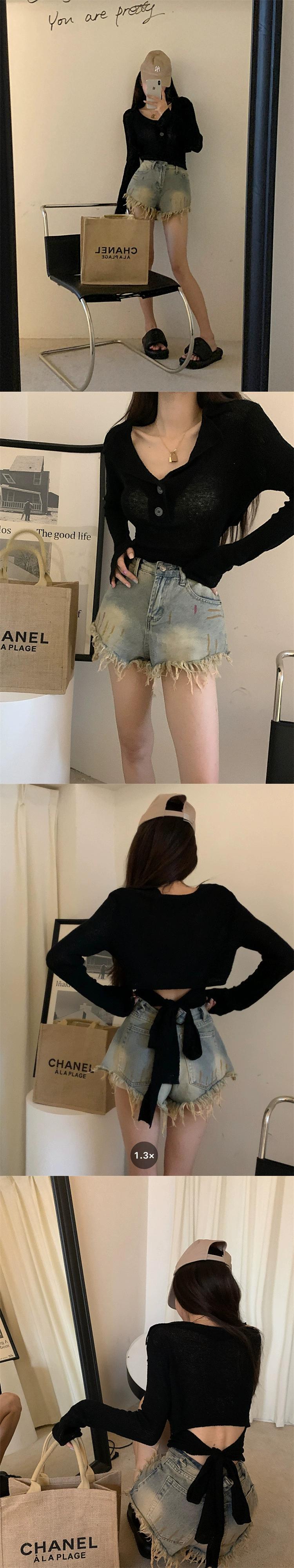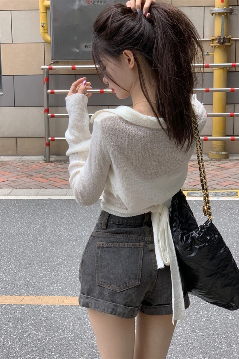 有能な気質ラペルオープンバックタイニットセーターレディース2023年春新作スリムフィットオールマッチ半袖長袖トップ ロング スプリング 春物 0921970191790257