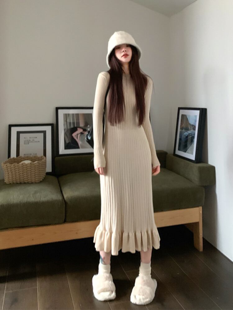 ニッチデザインセンスニット長袖ドレス女性の春と秋 2023 新しいオールマッチ底フィッシュテールセーターミッドレングススカート ロング スプリング 春物 オータム 秋物 0921965572357919