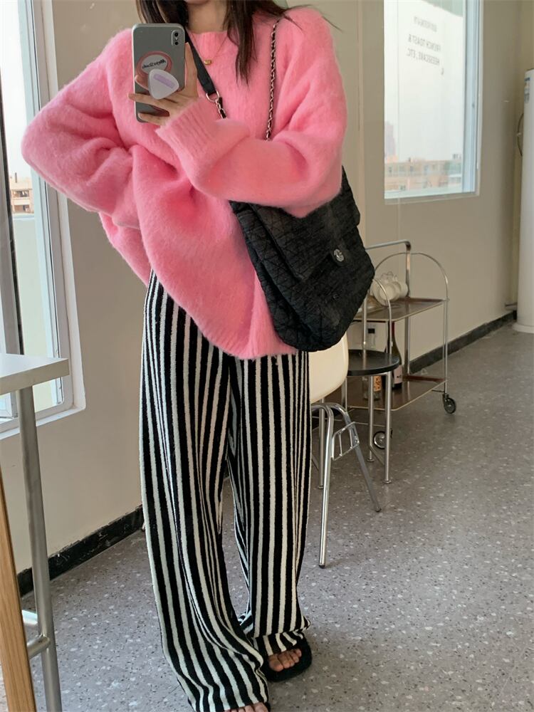 色:ピンクのセーターワンピース,ストライプパンツワンピース