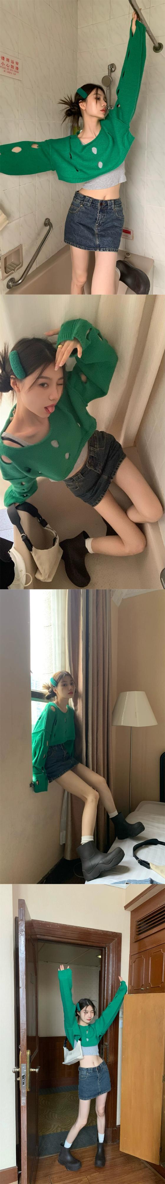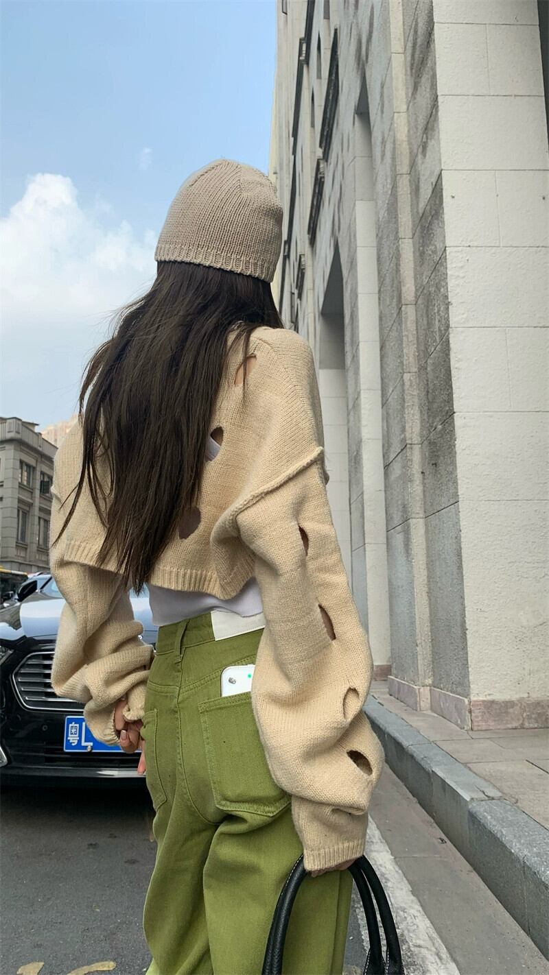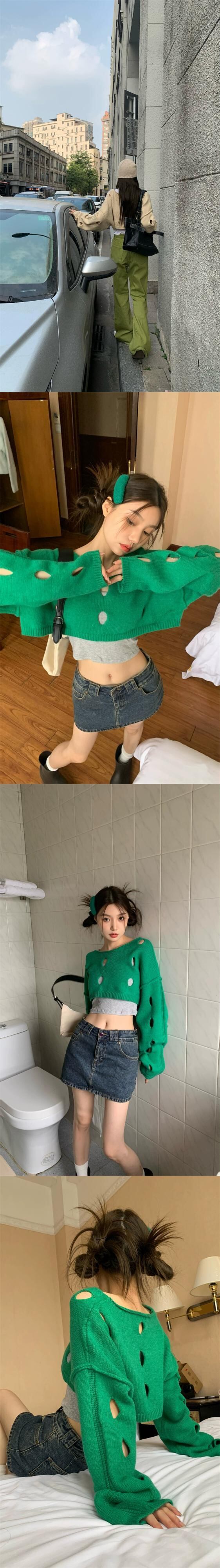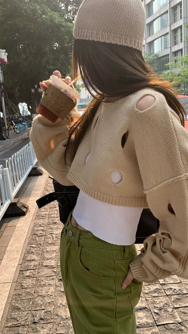 Spice Girl 中空ラウンドネックショート長袖ニットウェア レディース 2023 春 センス 万能 ルーズトップ トレンド ロング スプリング 春物 Oネック 092198471397835
