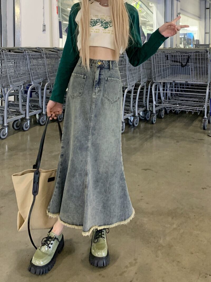 レトロファッションウォッシュスカートレディース2023春新作ミドル丈ルーズスリムデニムAラインスカート スプリング 春物 0921935959478379