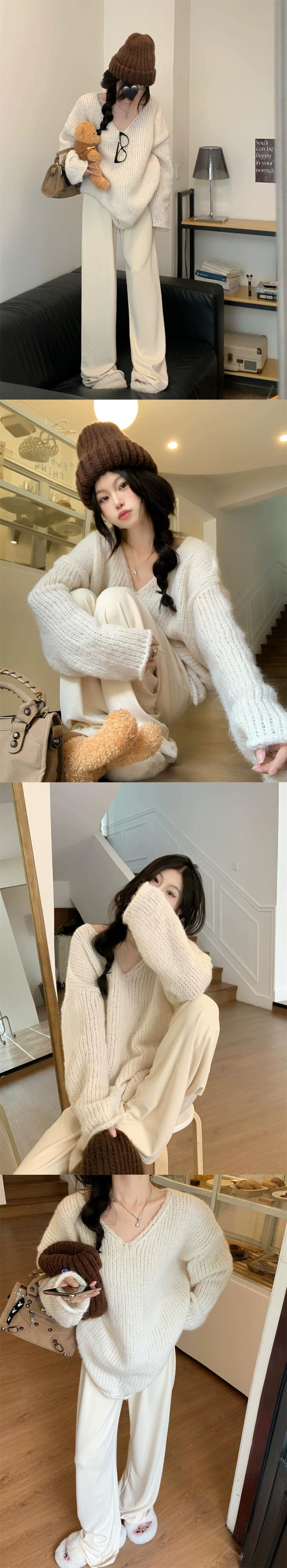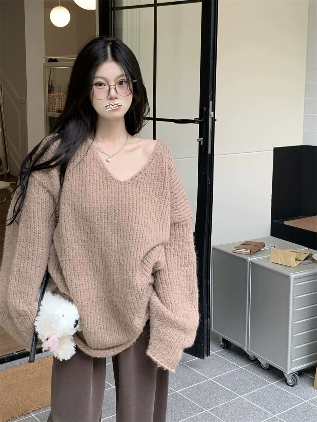 優しい風ベージュ V ネックプルオーバーセーターレディース春怠惰な風セータールーズミッドレングス長袖トップ ロング スプリング 春物 Vネック 0921997719745745