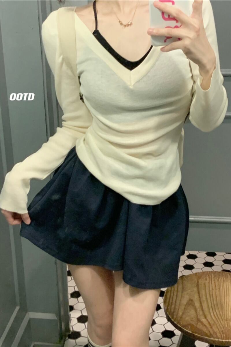 バレエスタイルスカート女性 2023 春の新長袖ニットセータースリムサスペンダー薄いスカートスリーピーススーツ ロング スプリング 春物 0921929584265674