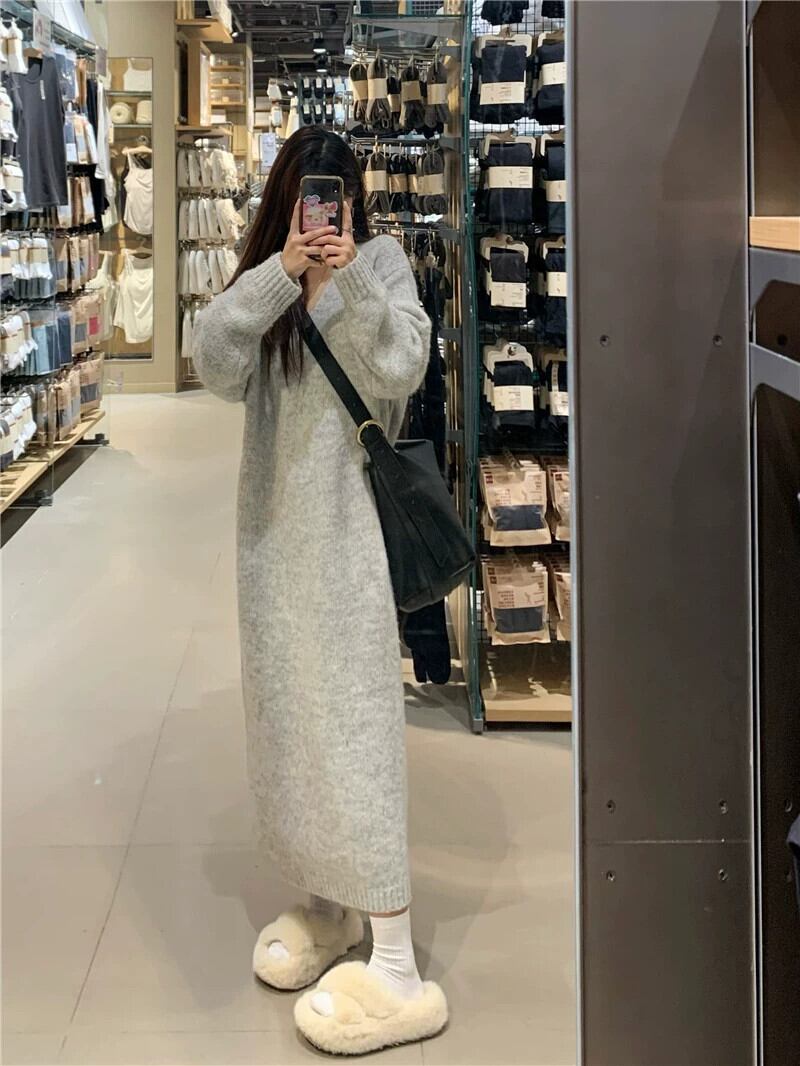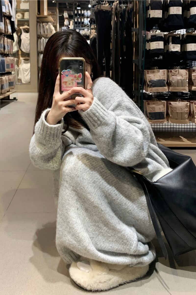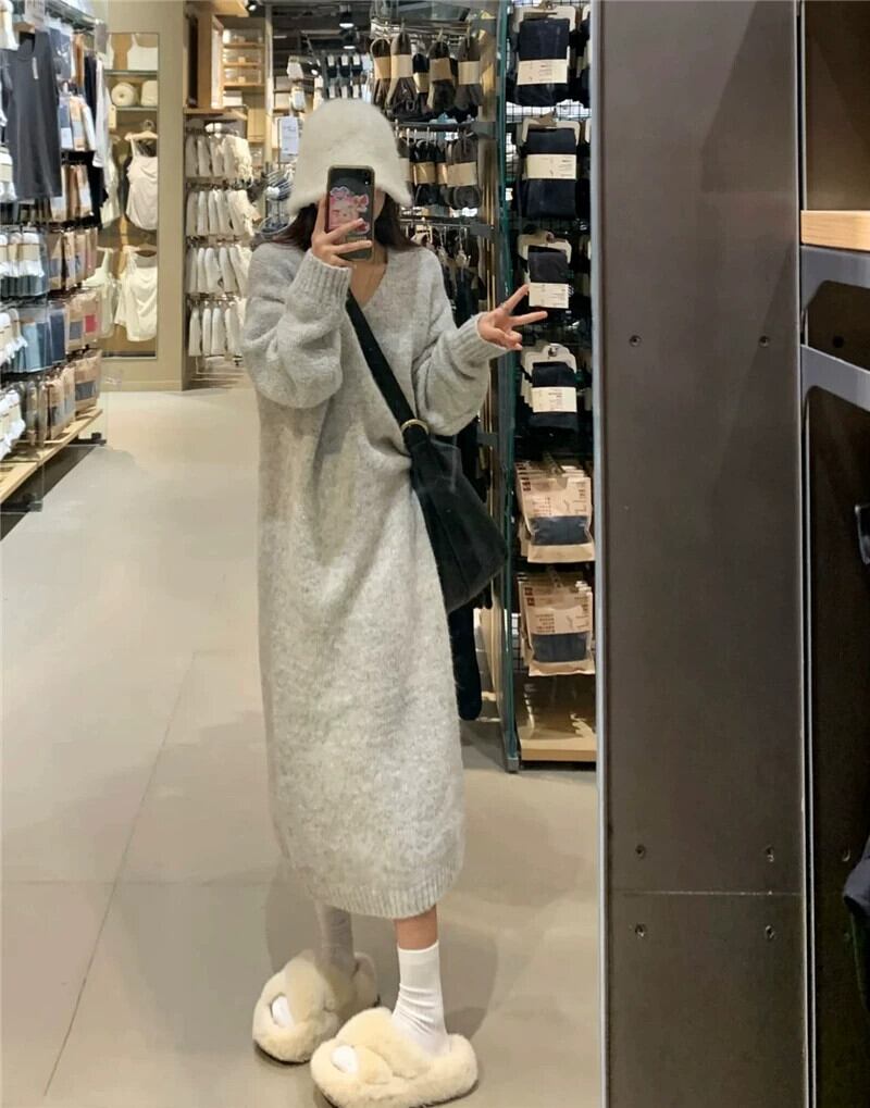優しくて柔らかい孔子怠惰な風 V ネックニットドレス女性の春と秋 2023 新しいオールマッチルーズで薄いセータースカート スプリング 春物 オータム 秋物 Vネック 0921987054559428