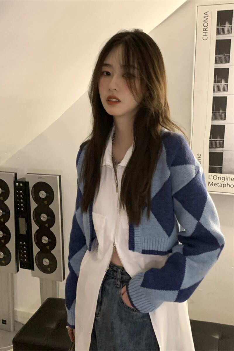 怠惰なスタイルのレトロな菱形のセーターの女性の 2023 春の新色コントラスト V ネックルーズオールマッチニットカーディガンジャケット スプリング 春物 Vネック 0921948606610499