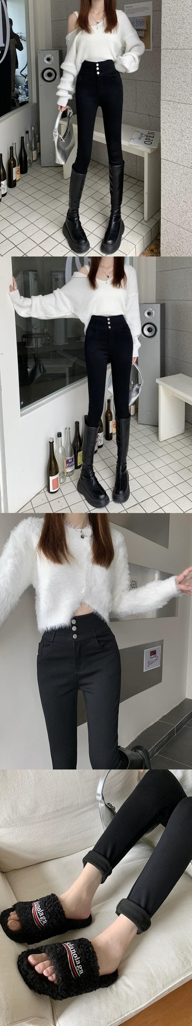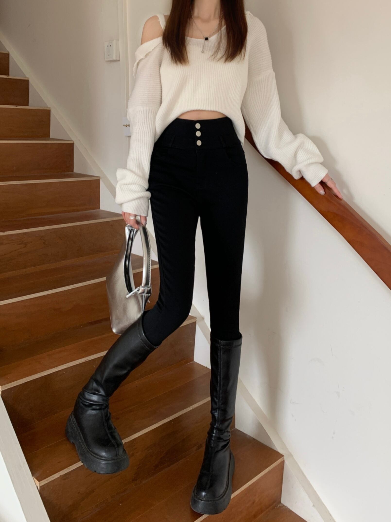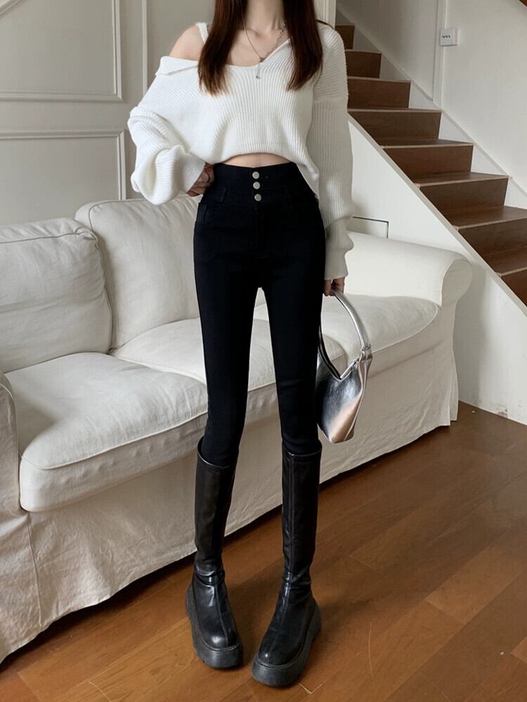 黒ベルベット肥厚弾性スキニージーンズ女性の春と秋の 2023 新しいオールマッチハイウエストデザインセンスペンシルパンツ ハイウェスト ブラック エラスティック 伸縮 スプリング 春物 オータム 秋物 0921943376265985