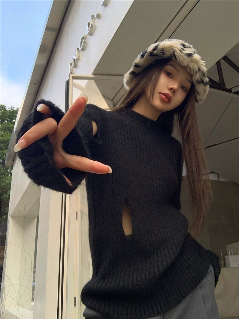 ホットブラック中空長袖ニットセーター女性の2023年春の新バージョンのスリムスリムニッチセータートップ ロング スプリング 春物 0921976782675996
