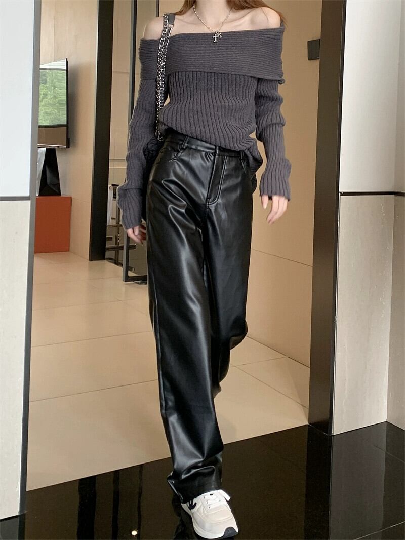 オールマッチブラックレトロカジュアルパンツ女性の冬の 2023 新しいファッション痩身ルーズストレートハイウエスト PU レザーパンツ ウィンター 冬物 0921960258284314