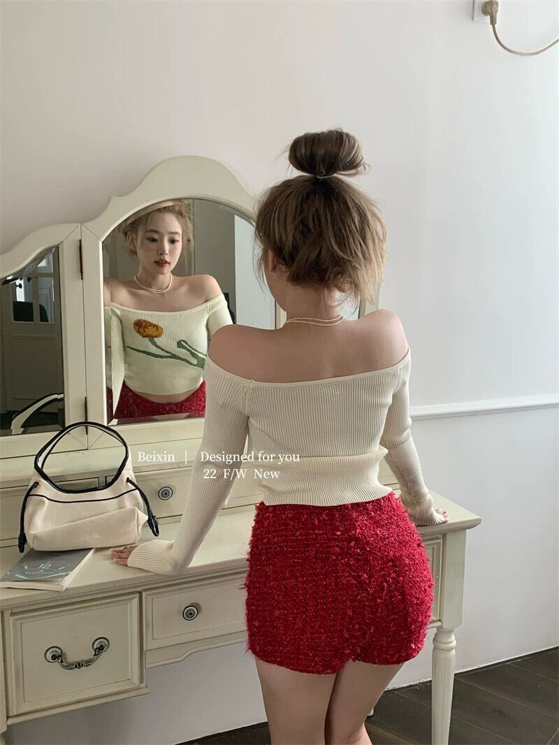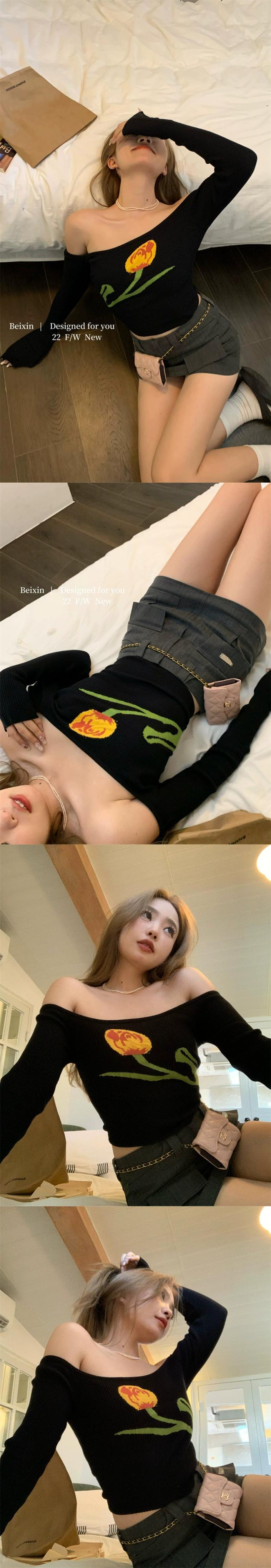 スパイスジャカードワンショルダースリムスリム長袖ニットセーターレディース2023春新作ショートボトムシャツトップ ロング スプリング 春物 0921923950383970