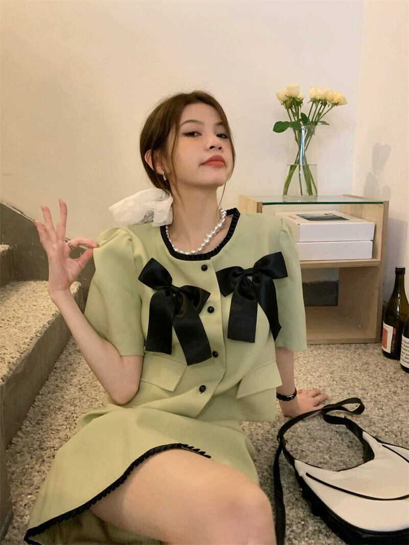 小さな香りのスーツの女性の 2023 夏の新デザインの弓半袖トップスカートファッションツーピーススーツ リボン サマー 夏物 0921997462198096