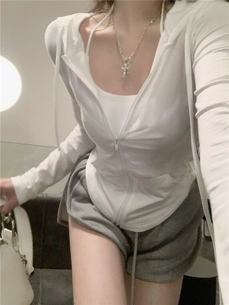 スタイルイン無地オールマッチフード付き日焼け止めジャケット女性の夏 2023 新しい不規則なスリムジッパーカーディガン サマー 夏物 ソリッドカラー 0921937166913257