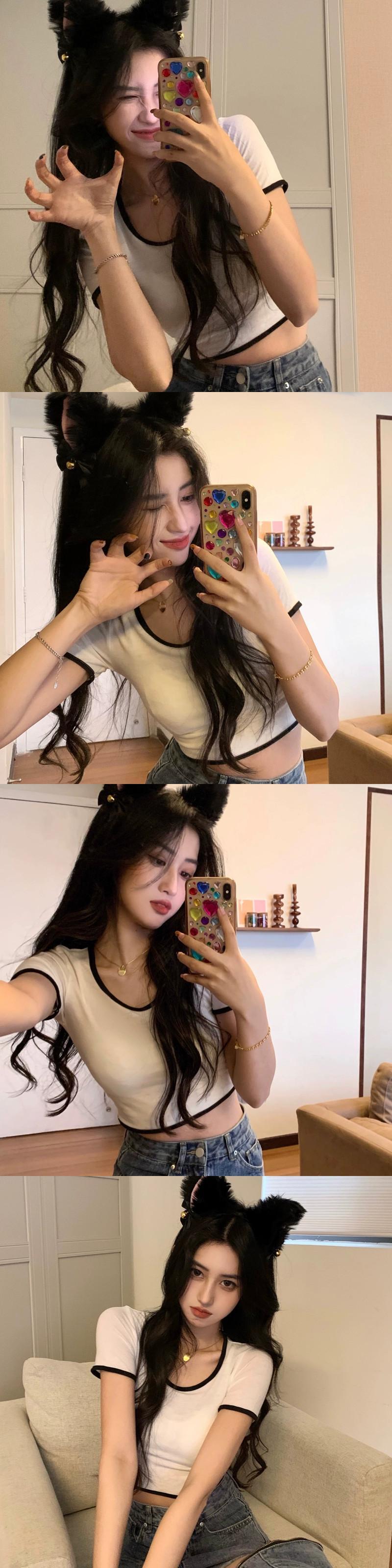 スタイルピュアディザイアヒットカラーラウンドネックTシャツレディース2023年夏新作スリムフィットと薄いショートオールマッチトップス サマー 夏物 Oネック 0921982376685522