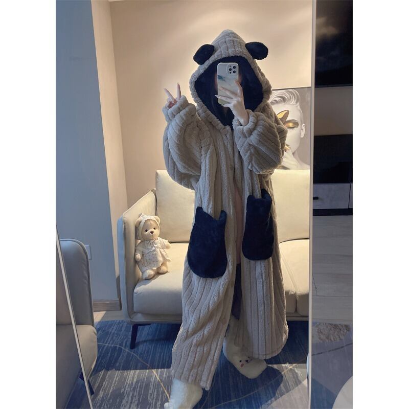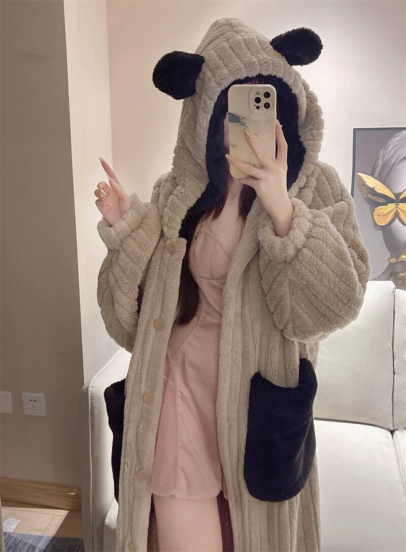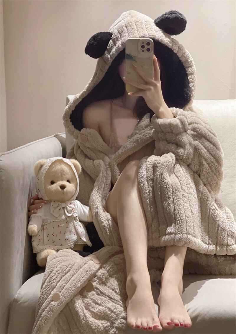 かわいい風の色のコントラスト年齢を軽減するフード付きネグリジェ女性の春と秋 2023 新しい怠惰な風ソフトワックス状長袖コーラルフリースカーディガン ロング 大人ガーリー スウィート キュート カジュアル スプリング 春物 オータム 秋物 0921950121794673